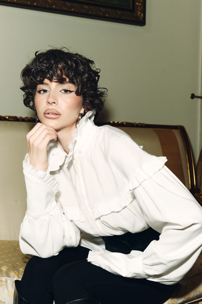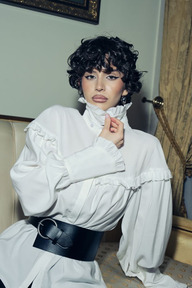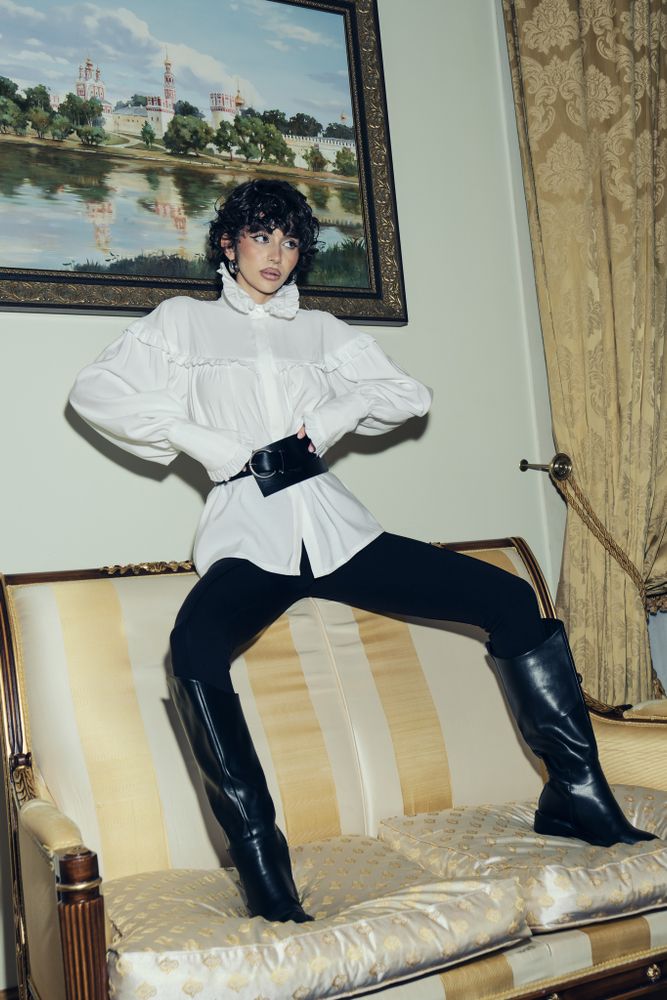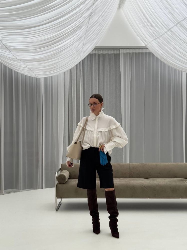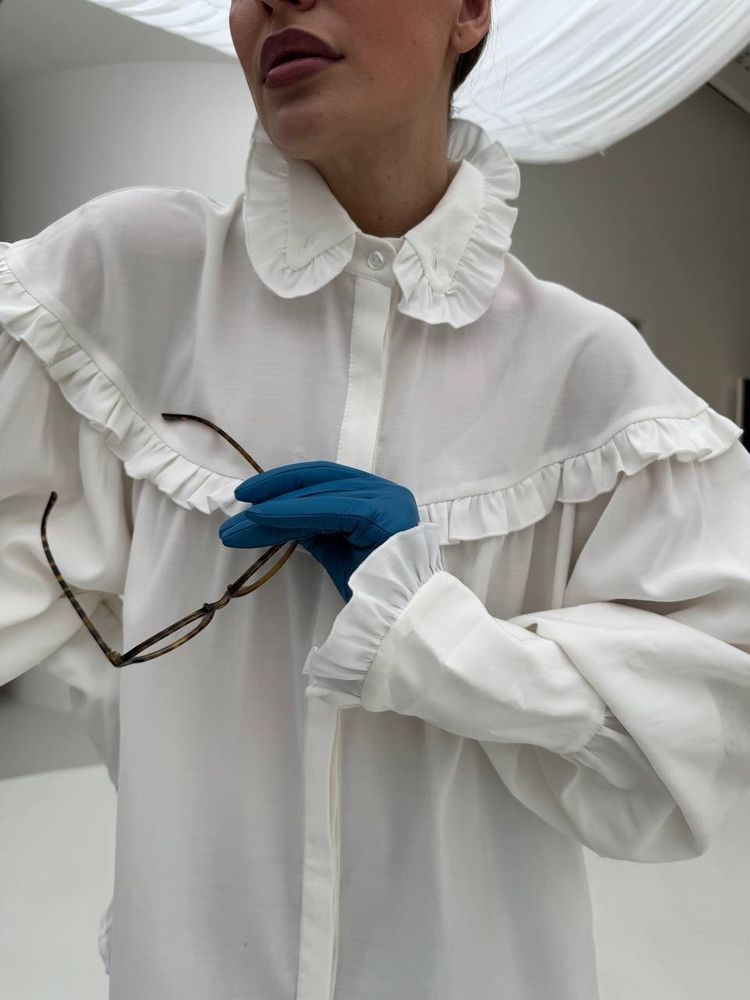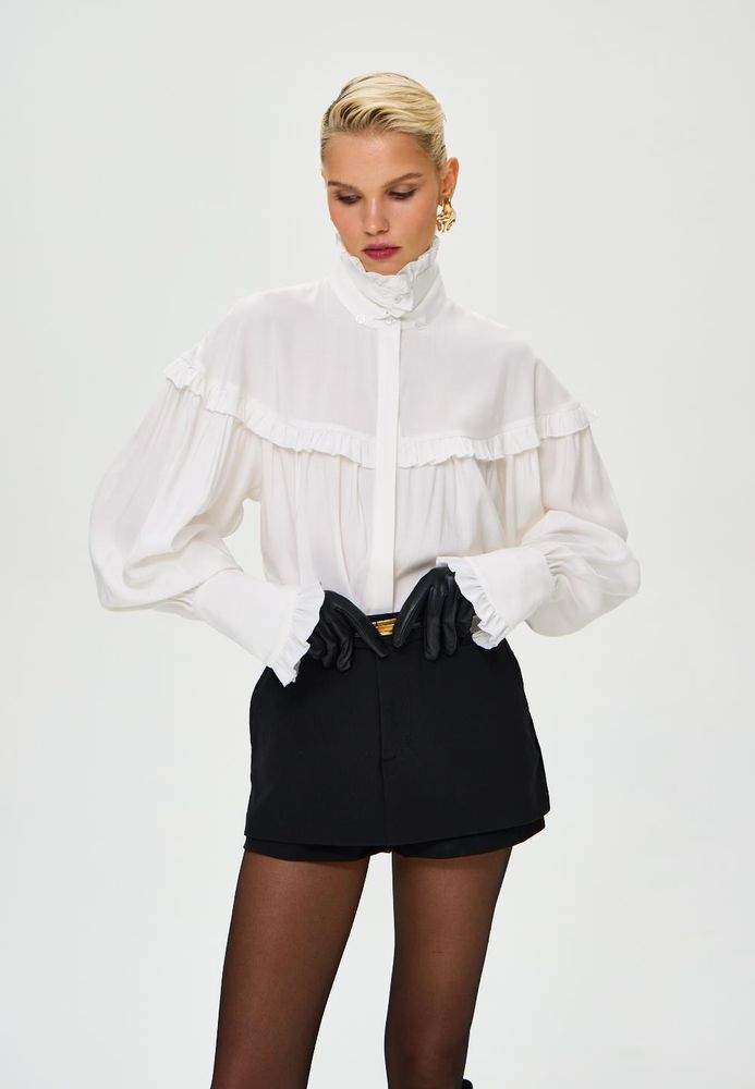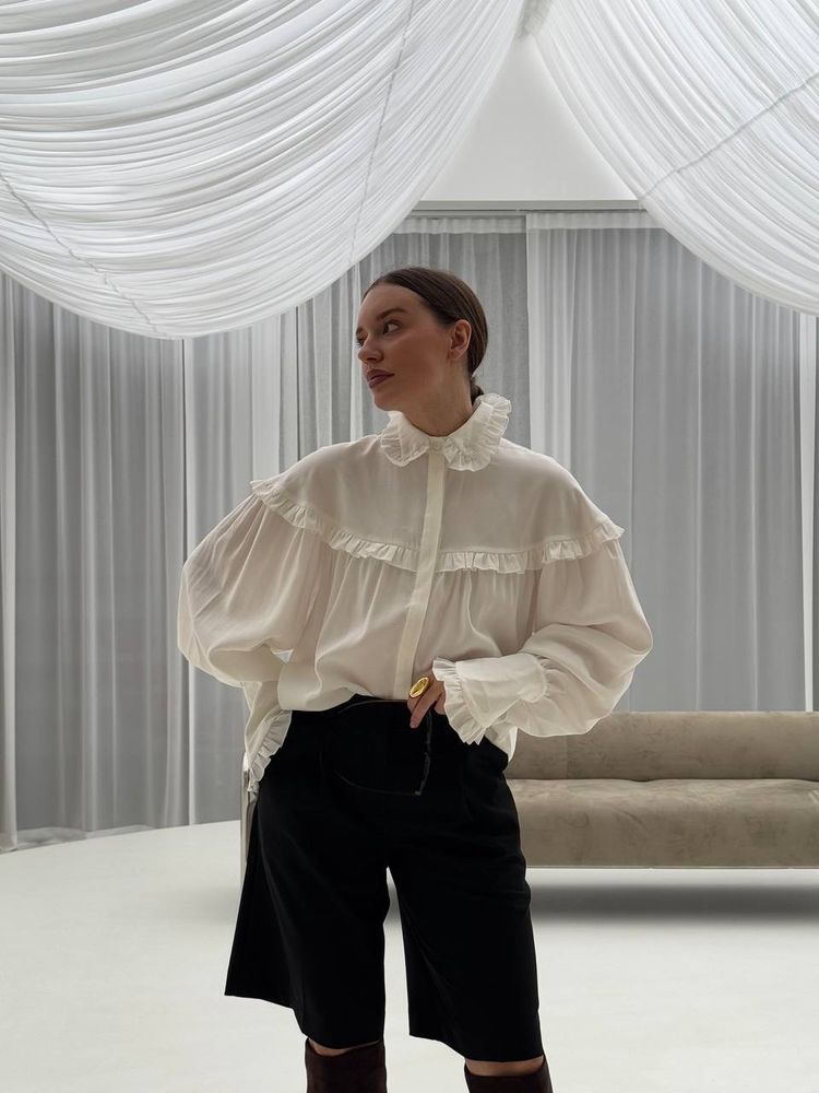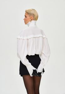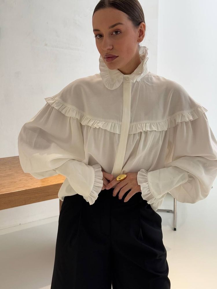 Блуза свободного кроя в готическом стиле, объемные рукава и шикарные длинные манжеты, воротник стойка - все эти элементы придадут вашему образу некую драматичность и экстравагантность. Но если уложить воротник, надеть с джинсами или цветной юбкой, то она уже придаст образу романтичный стиль.
