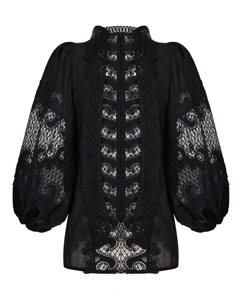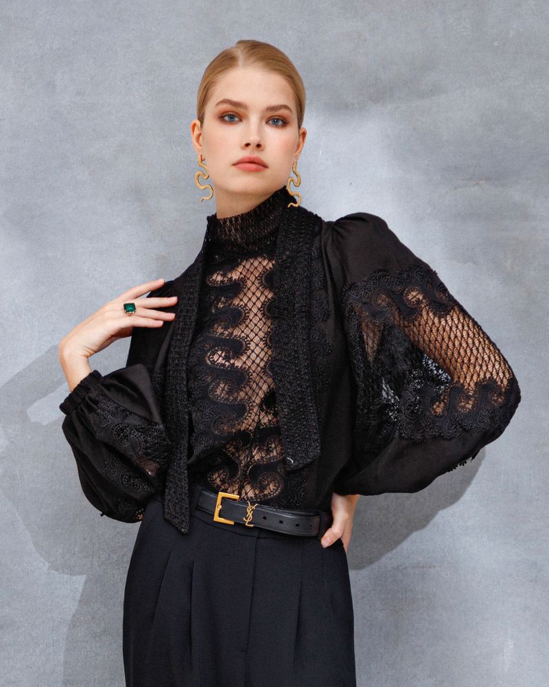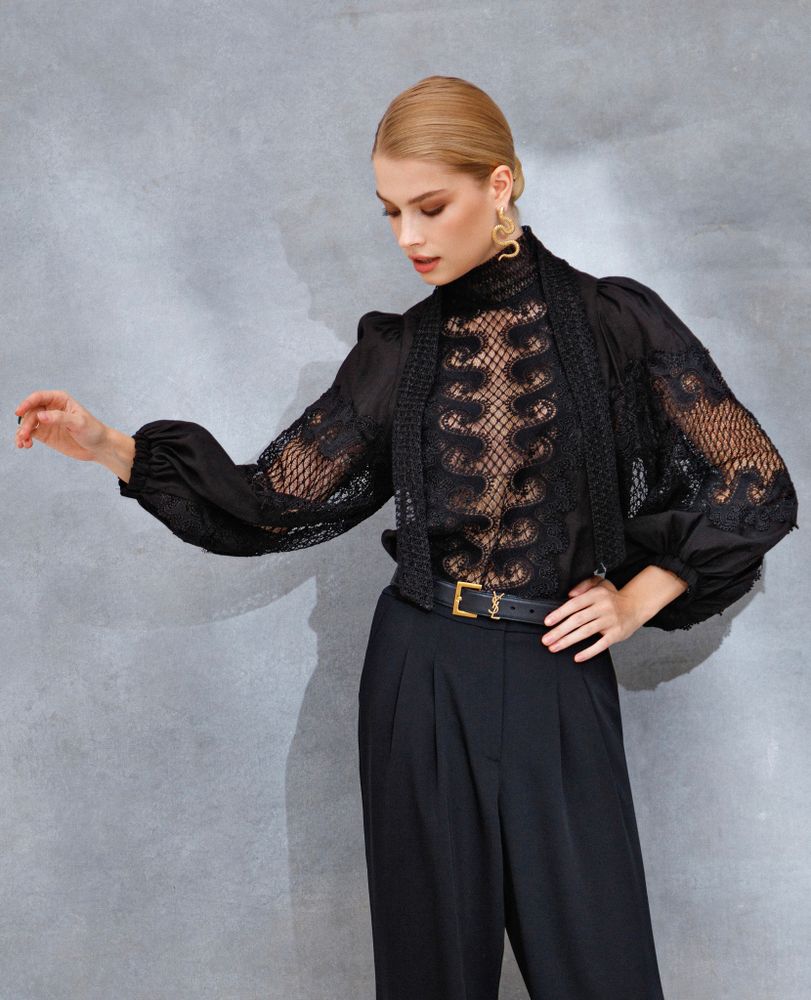 Блуза выполненная из приятной к телу вискозы с оригинальным шитьем спереди и на объемных рукавах.