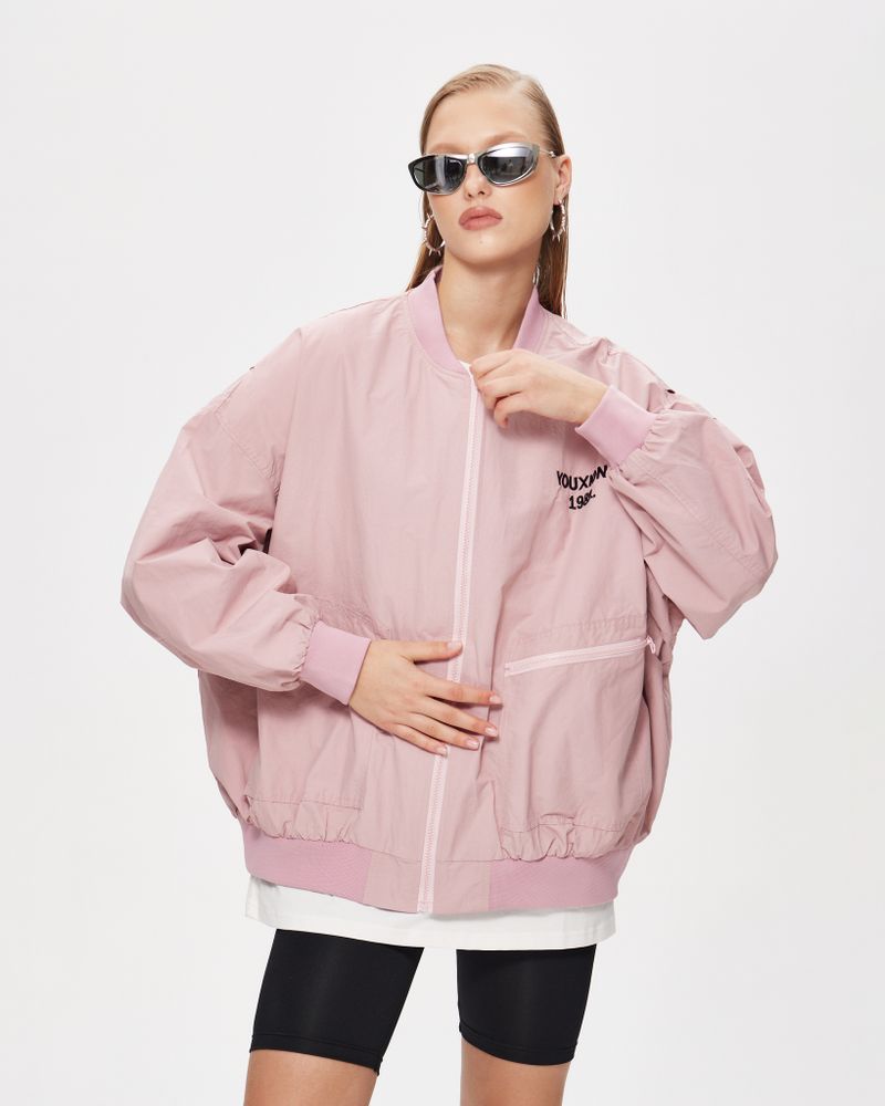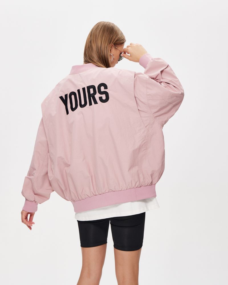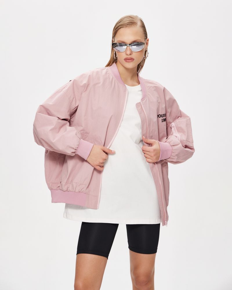 Бомбер в стиле oversize пудрового цвета на молнии, с резинками внизу и на рукавах, с надписями.