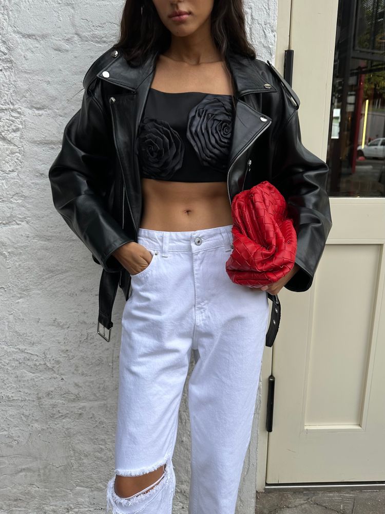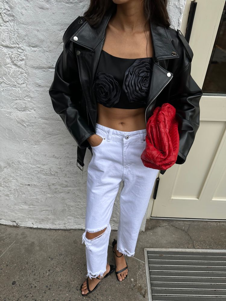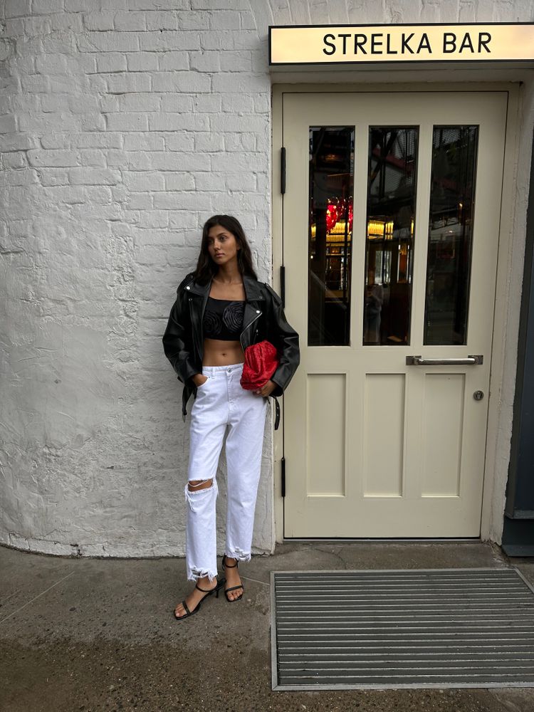 Джинсы модели MOM со стильными рваными дырками на коленях, в двух цветах: голубой и белый.