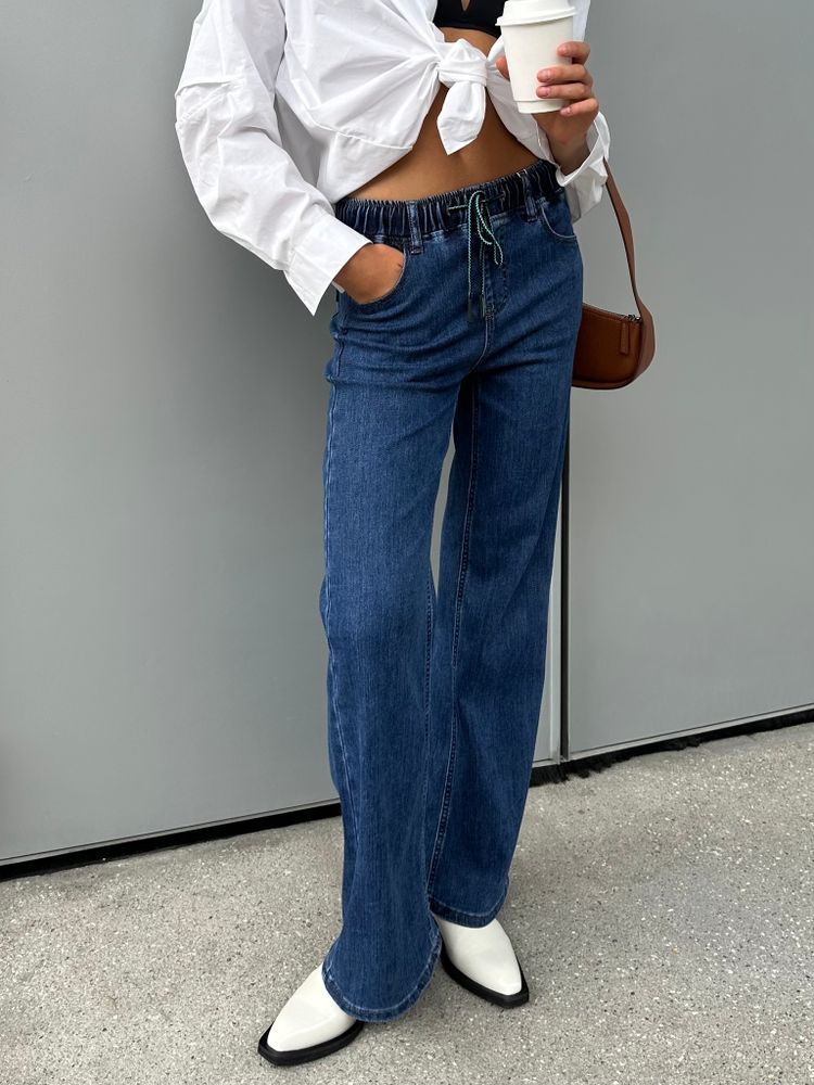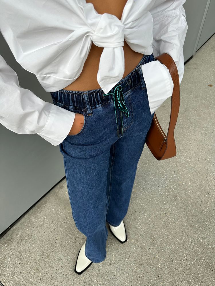 Джинсы свободные широкие на резинке с зеленым шнурком.