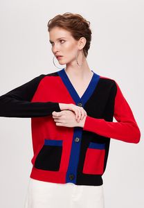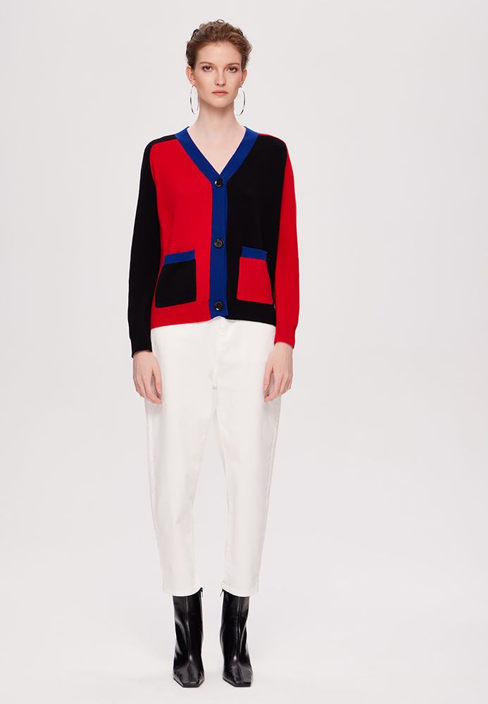 Кардиган шерстяной трехцветный с накладными карманами, на пуговицах.