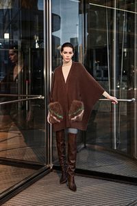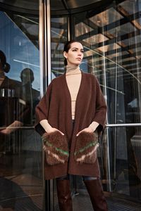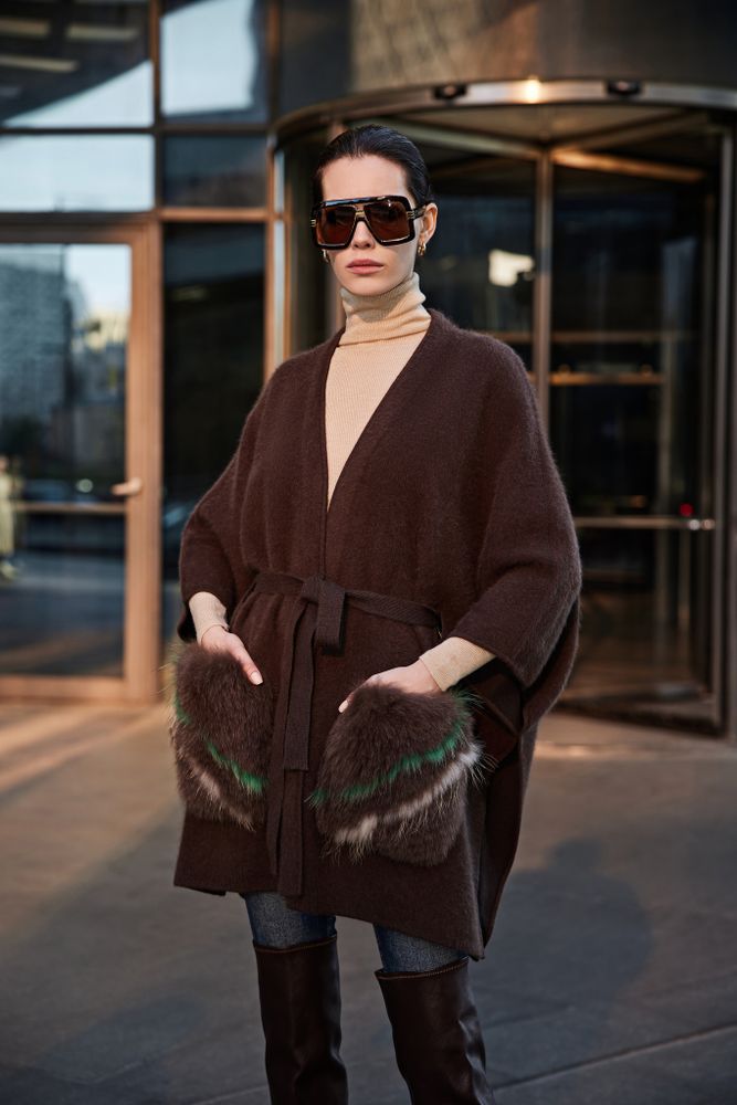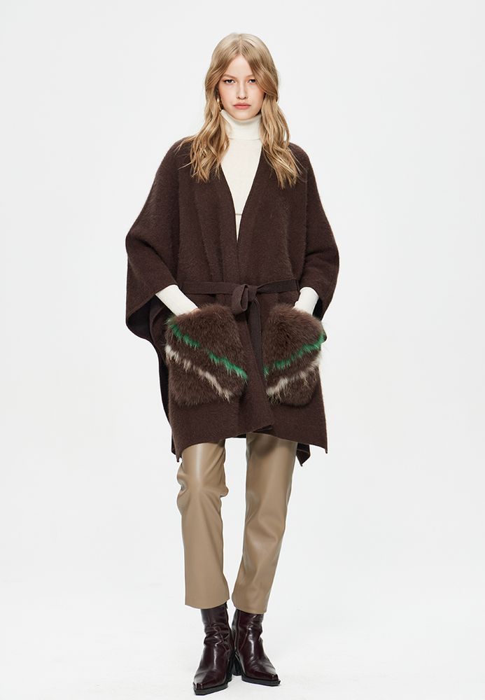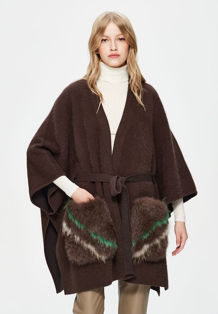 Кардиган-пончо с поясом с меховыми карманами из ангоры и шерсти премиум-качества.