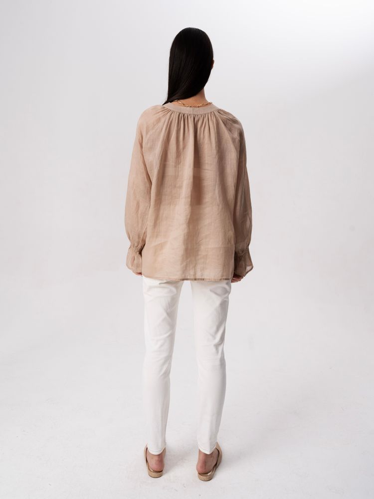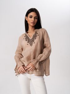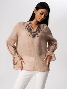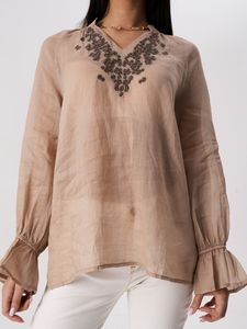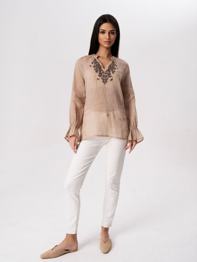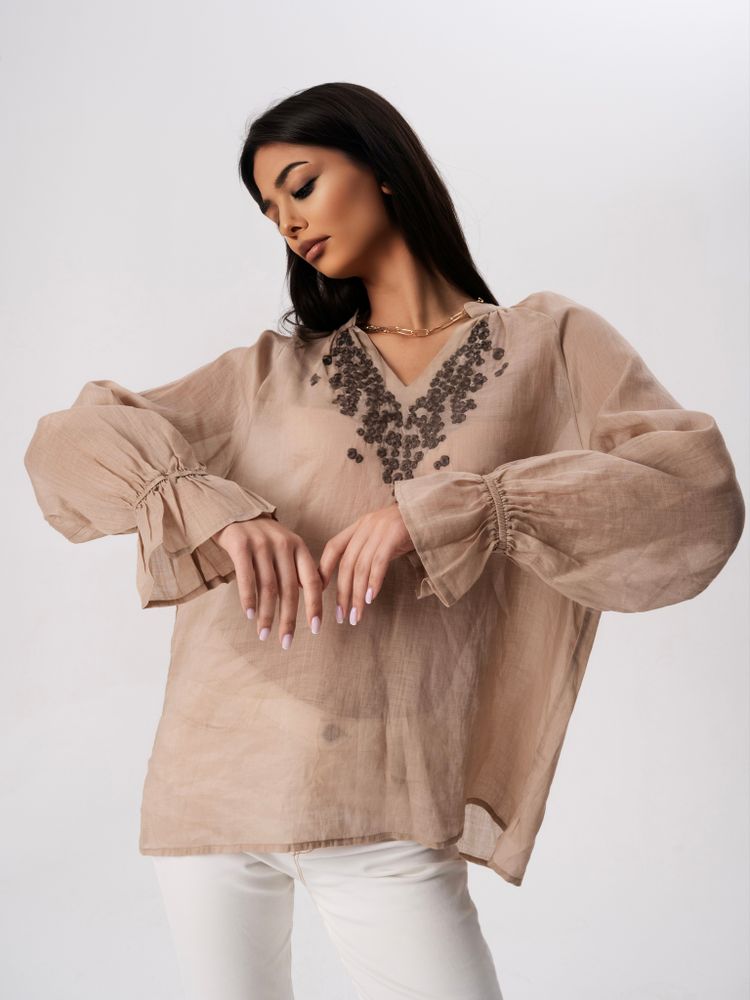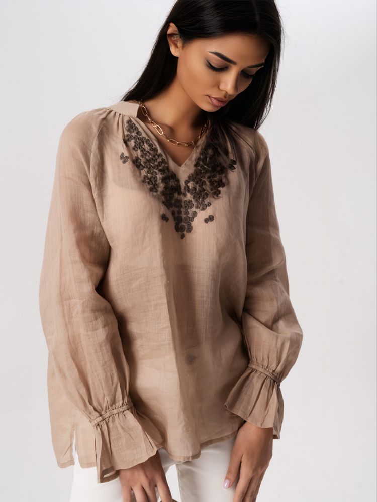 Блуза из натурального хлопка с вышивкой и V-образным вырезом горловины.
