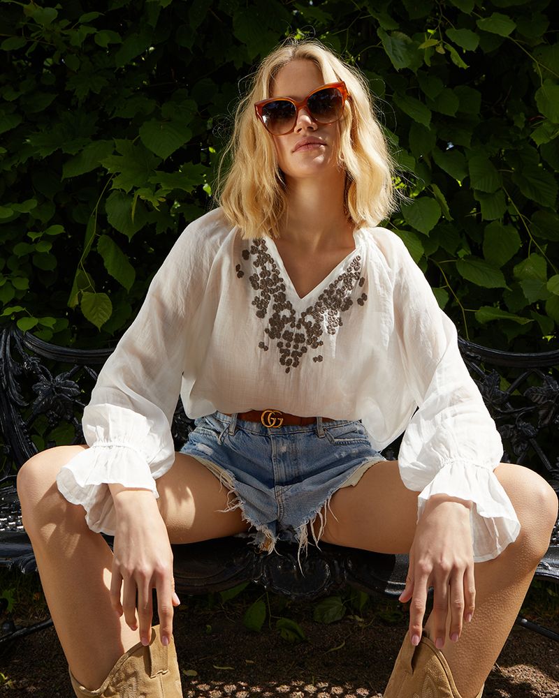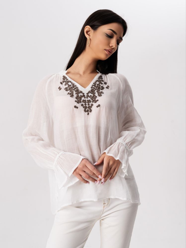 Блуза из натурального хлопка с вышивкой и V-образным вырезом горловины.