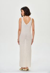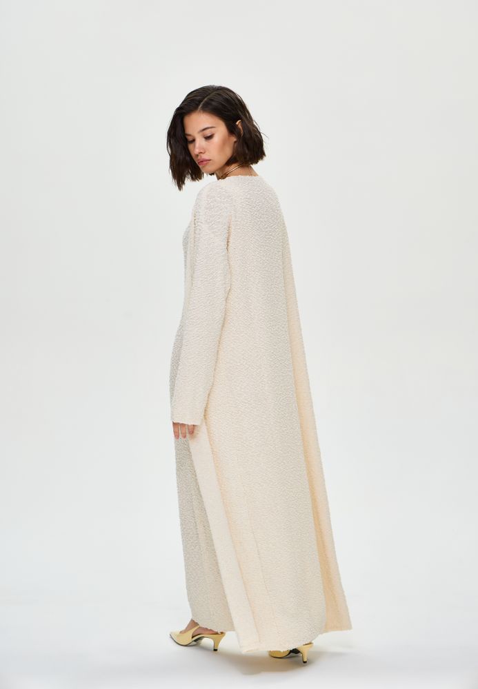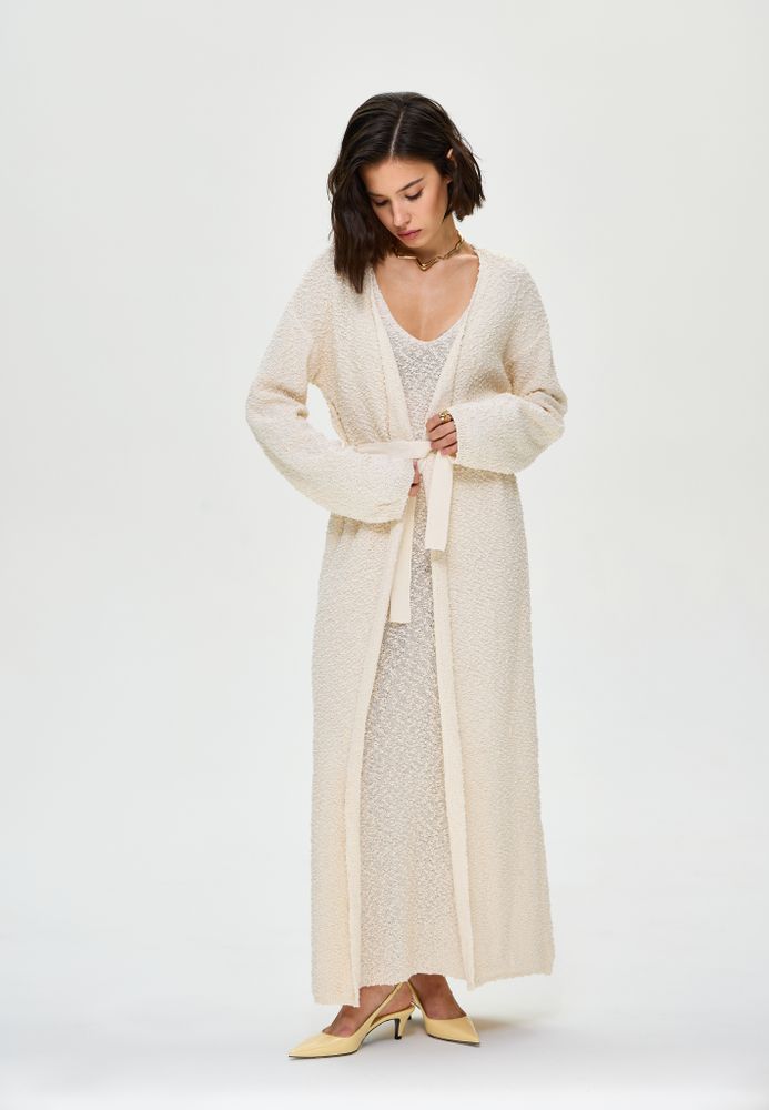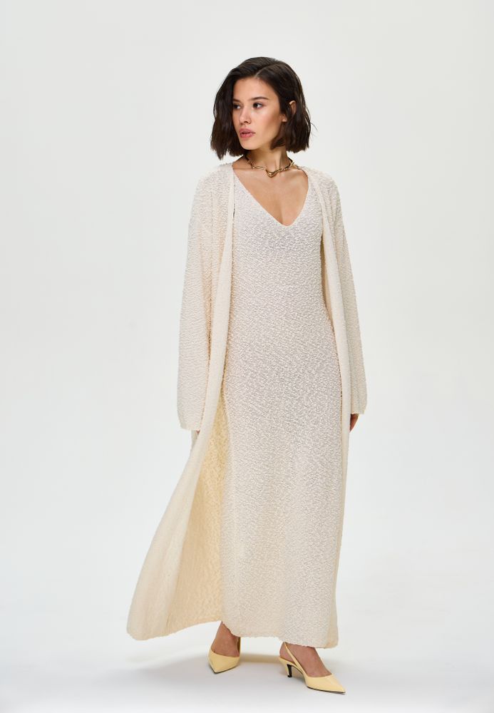 Костюм двойка из фактурного хлопкового трикотажа, в комплект входит платье без рукавов, кардиган свободного кроя и пояс в тон. Представлено в четырех базовых оттеках: молочный, бежевый, розовый и черный.Состав: 50% хлопок, 50% полиэстер.
