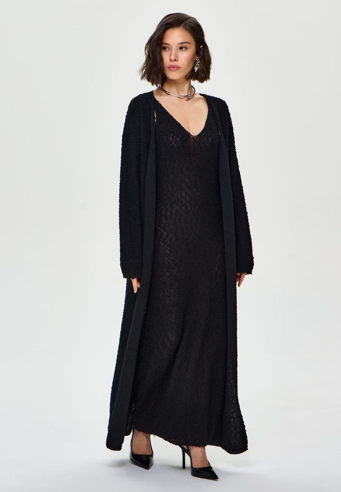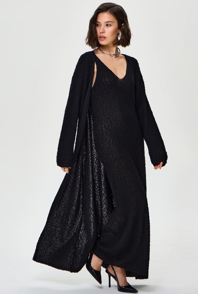 Костюм двойка из фактурного хлопкового трикотажа, в комплект входит платье без рукавов, кардиган свободного кроя и пояс в тон. Представлено в четырех базовых оттеках: молочный, бежевый, розовый и черный.Состав: 50% хлопок, 50% полиэстер.