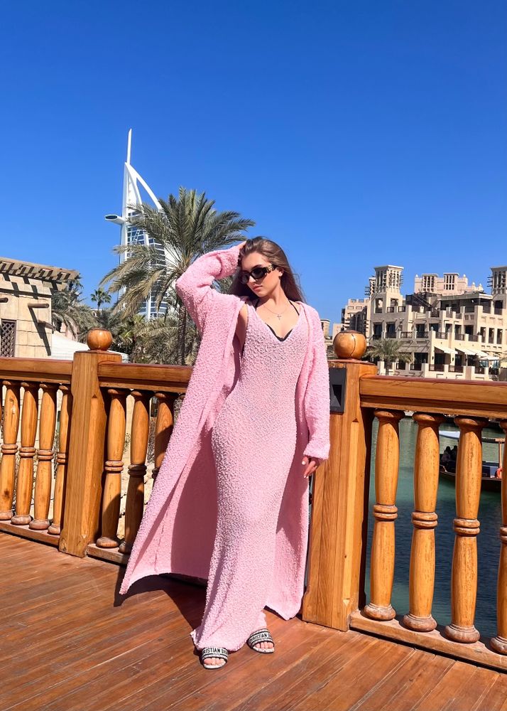 Костюм двойка из фактурного хлопкового трикотажа, в комплект входит платье без рукавов, кардиган свободного кроя и пояс в тон. Представлено в четырех базовых оттеках: молочный, бежевый, розовый и черный.Состав: 50% хлопок, 50% полиэстер.