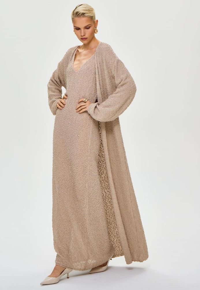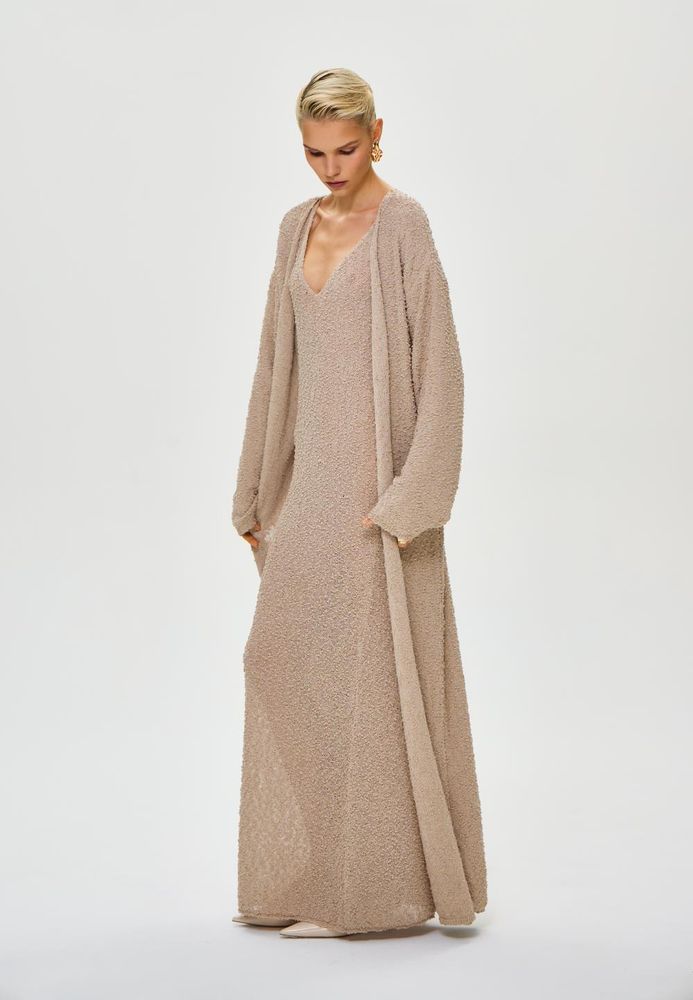 Костюм двойка из фактурного хлопкового трикотажа, в комплект входит платье без рукавов, кардиган свободного кроя и пояс в тон. Представлено в четырех базовых оттеках: молочный, бежевый, розовый и черный.Состав: 50% хлопок, 50% полиэстер.