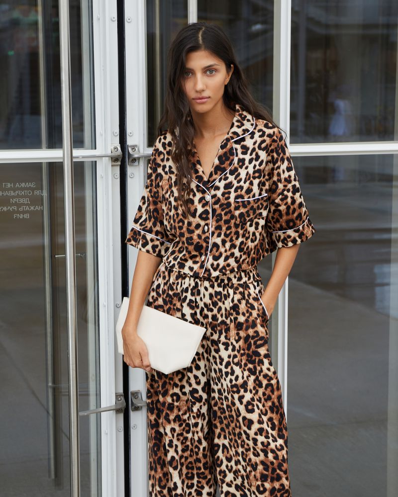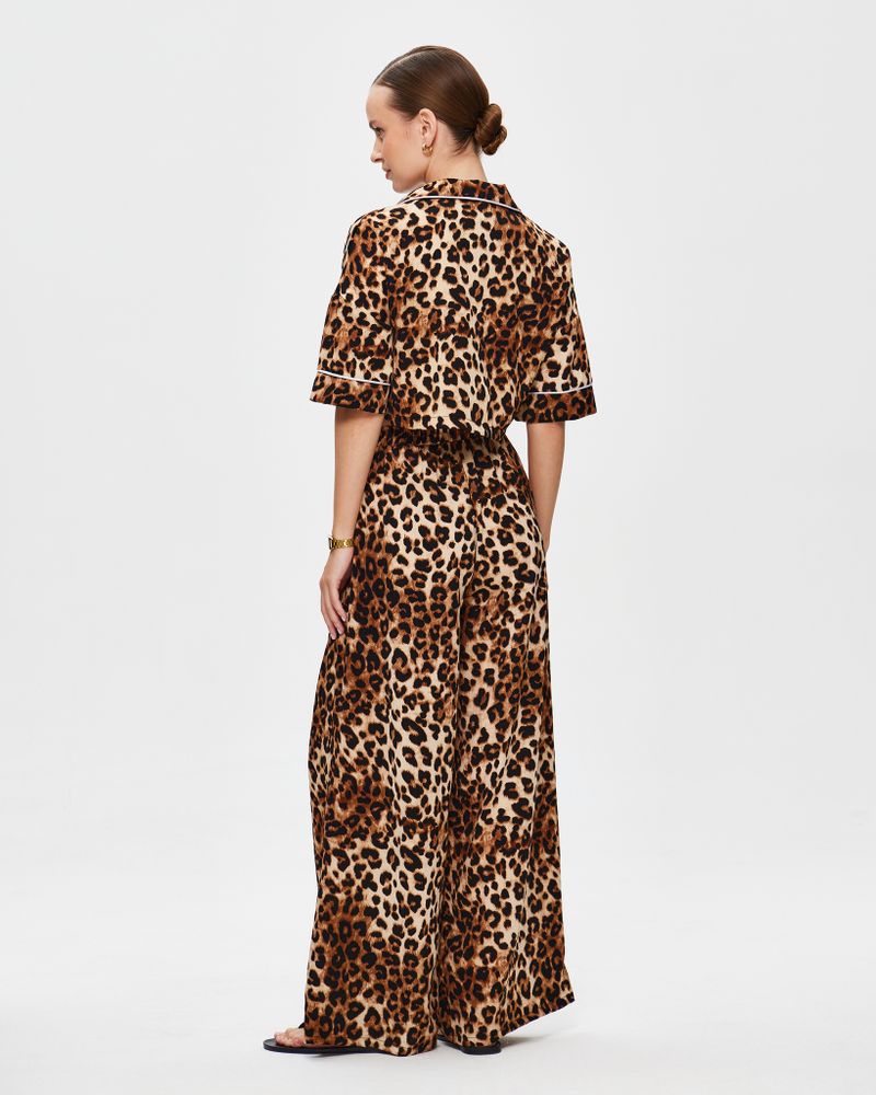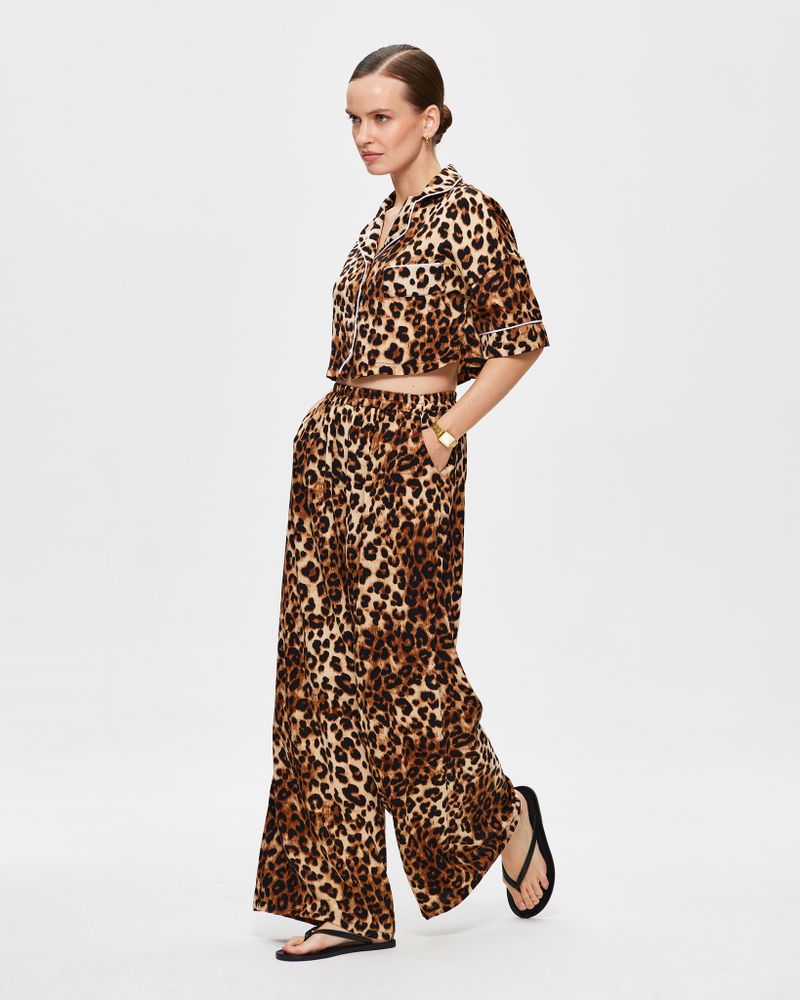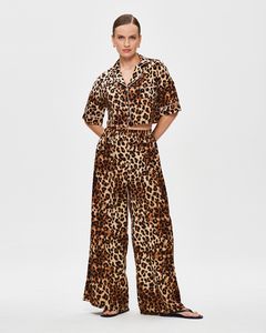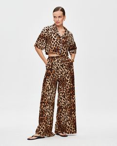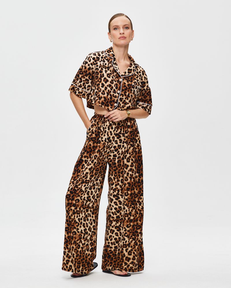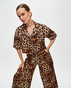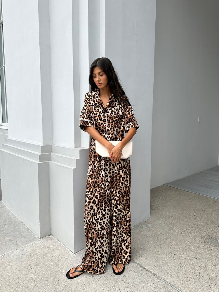 Брючный леопардовый костюм из шелка в пижамном стиле с рубашкой с коротким рукавом и свободными брюками.