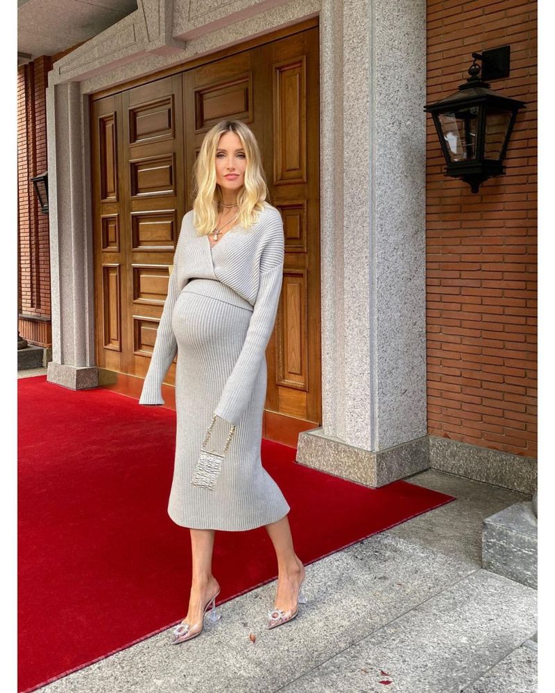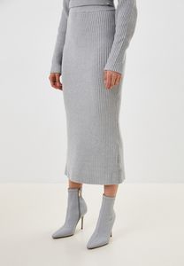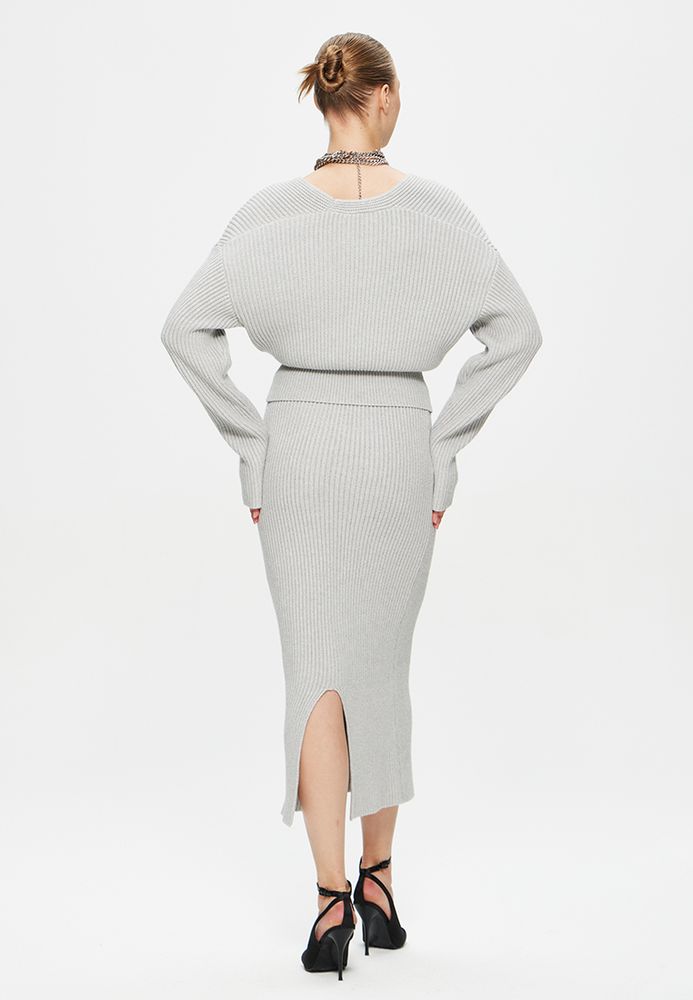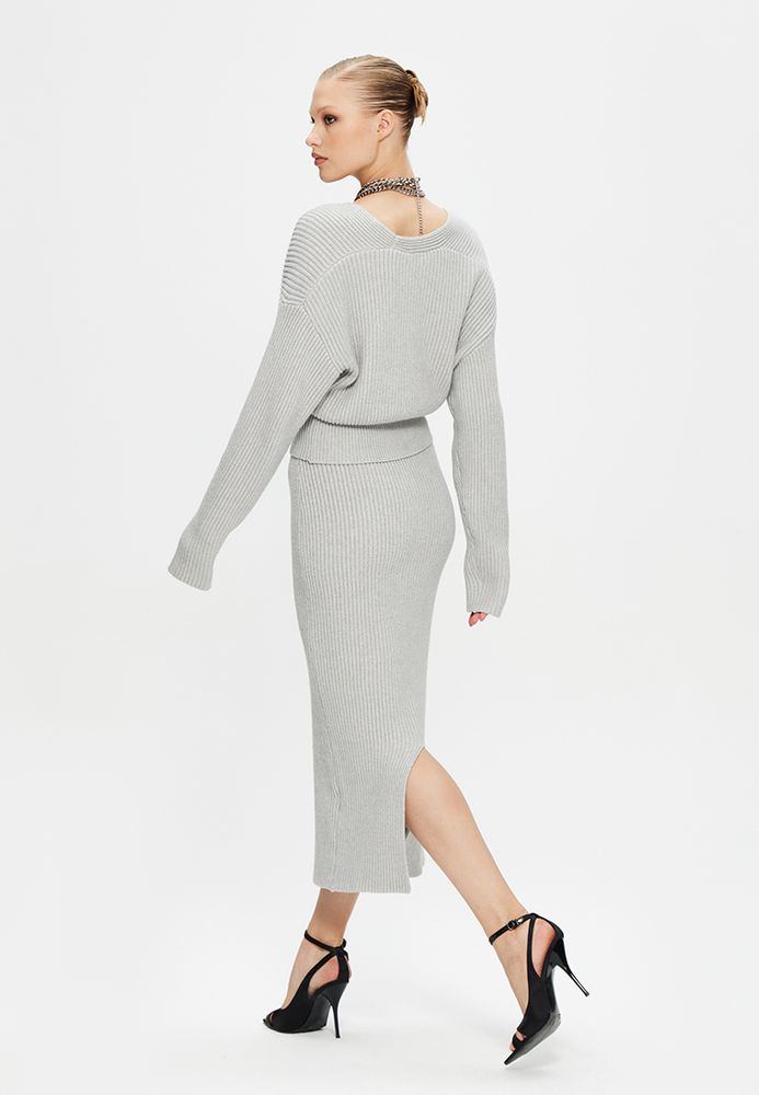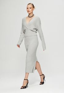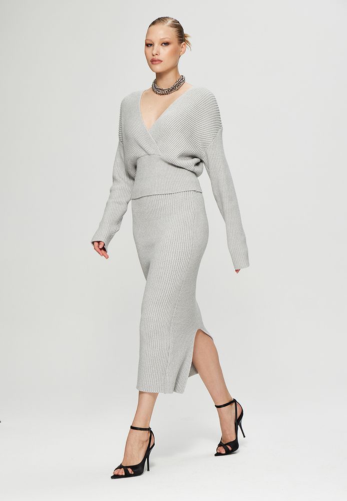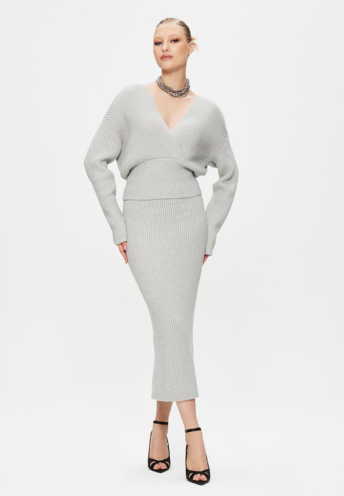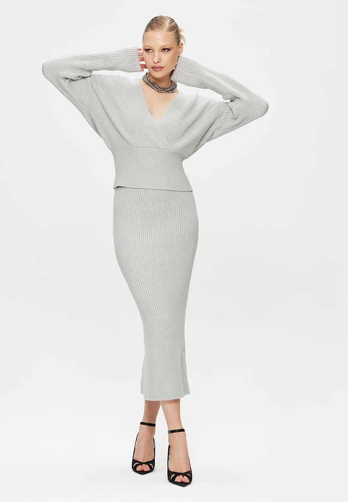 Трикотажный костюм премиум-качества сэлегантной юбкой и джемпером на запах с длинным рукавом.