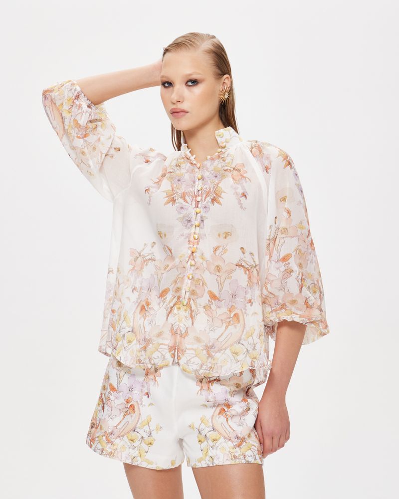 Костюм хлопковый летний с нежным цветочным принтом, комплект из блузы на пуговицах, шорт и плетеным поясом.