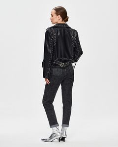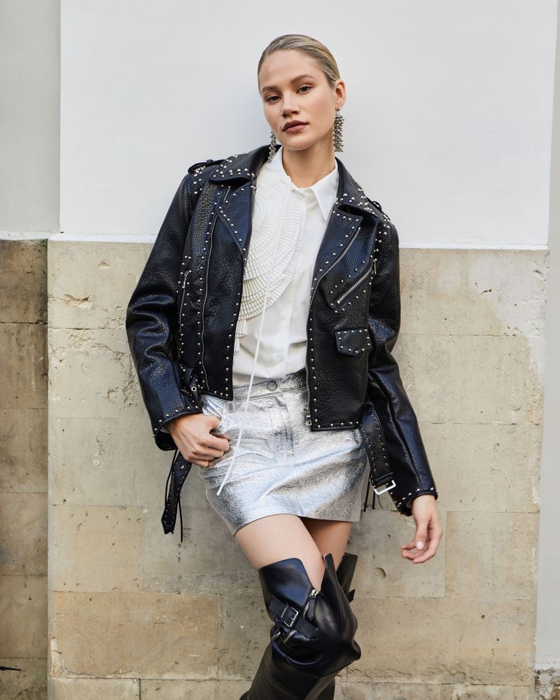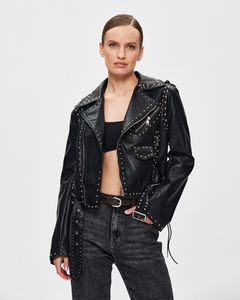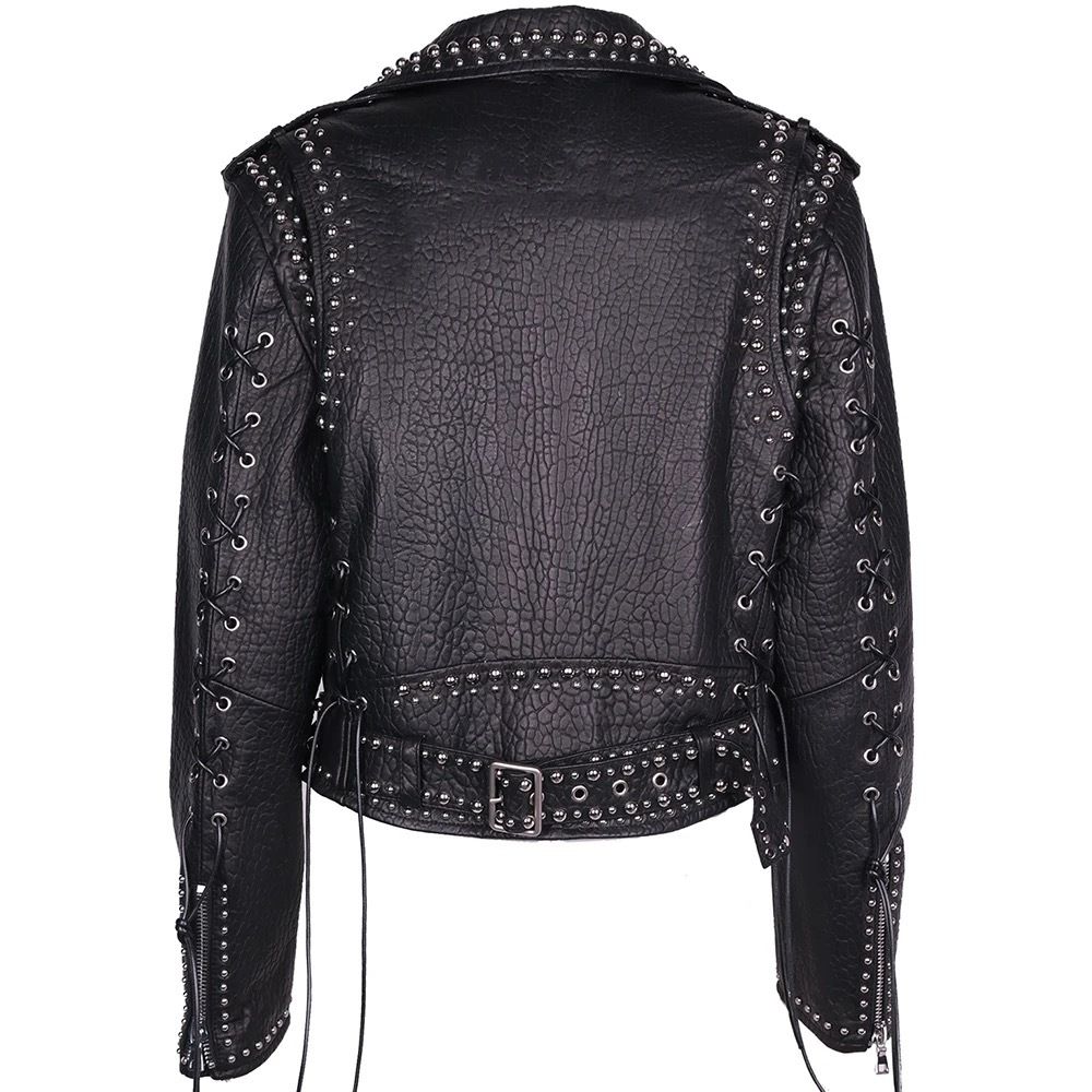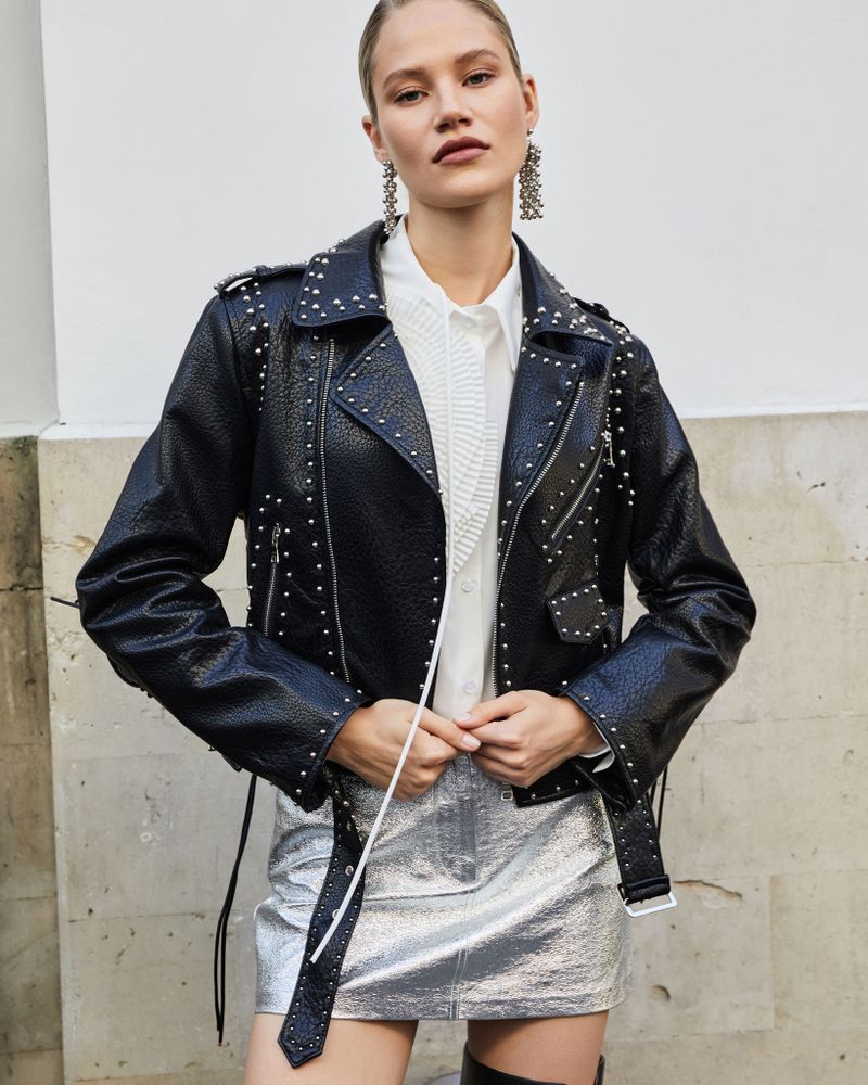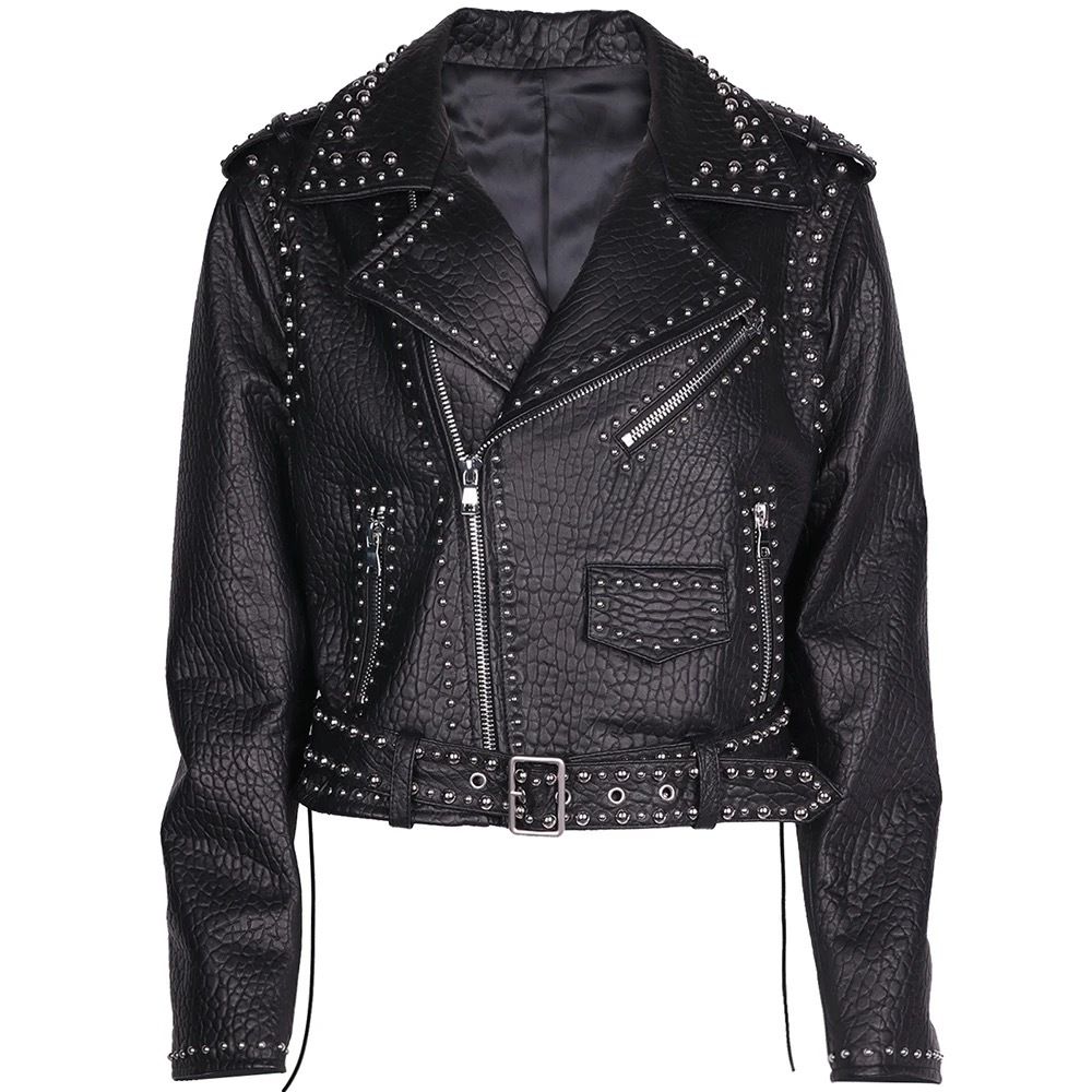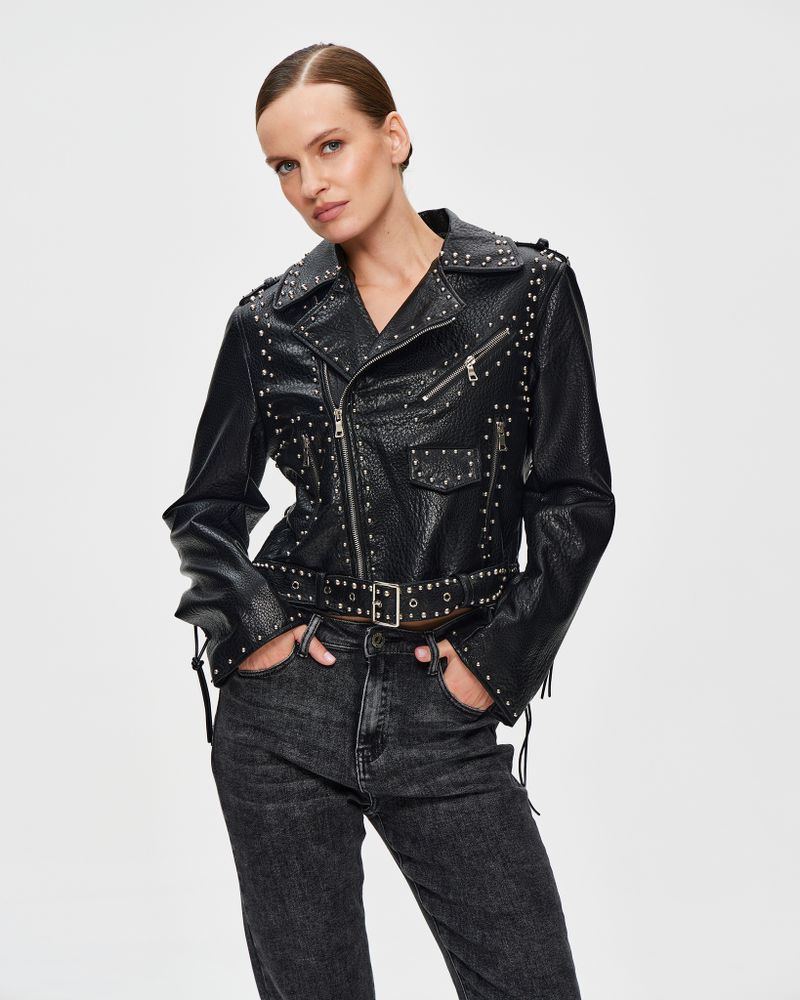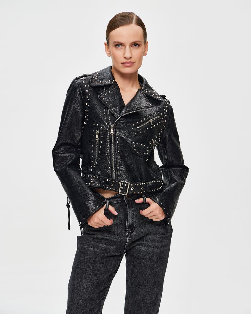 Куртка-косуха из экокожи в байкерском стиле с клепками и ремнем.