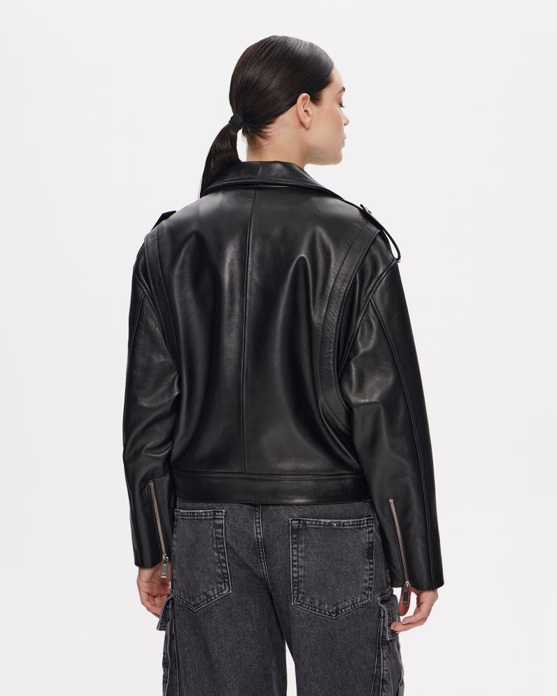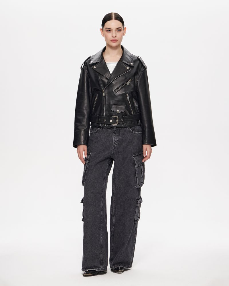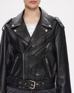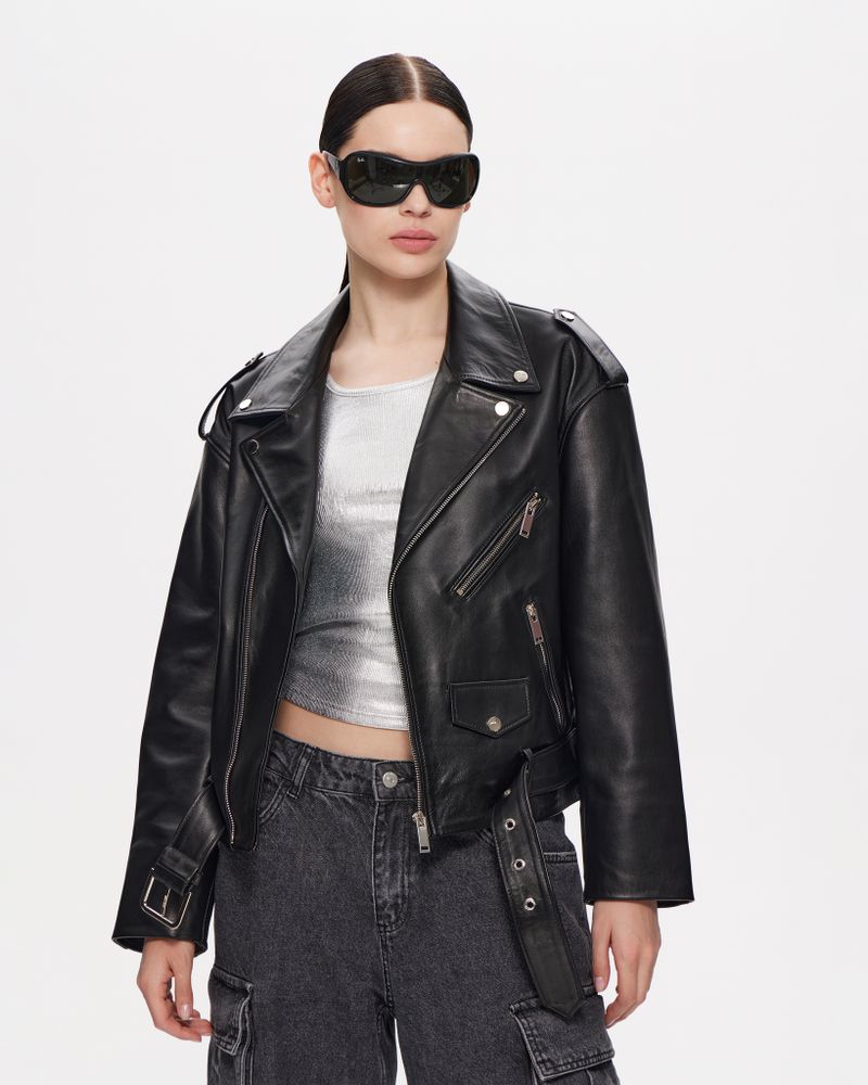 Куртка-косуха выполнена в черном цвете из натуральной гладкой кожи премиум качества. Куртка выполнена в стиле oversize и дополнена качественной фурнитурой и ремнем внизу. Косая застежка спереди и застежка-молния на рукавах.