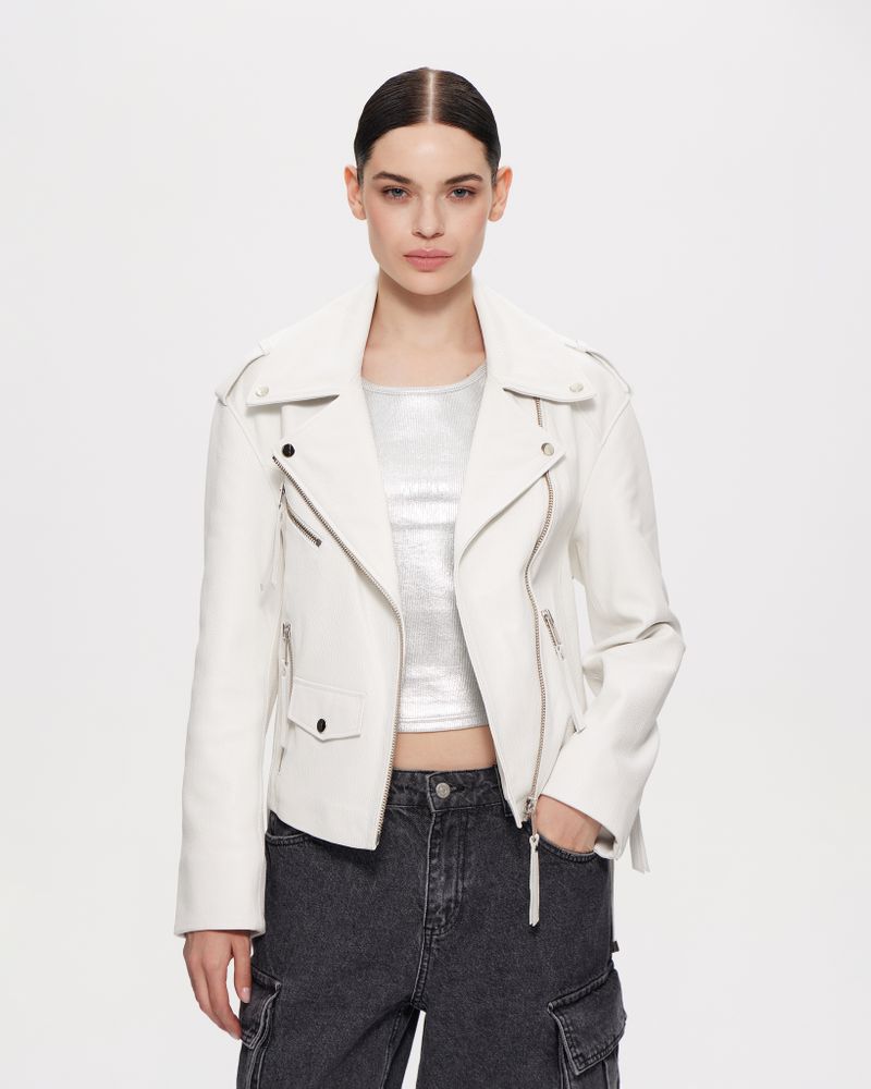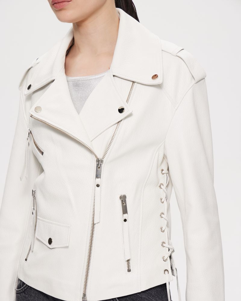 Куртка белого цвета из натуральной кожи премиум качества в стиле сафари со шнуровкой по бокам. Куртка дополнена качественной фурнитурой серебряного цвета и шнуровкой по бокам, спереди косая застежка.