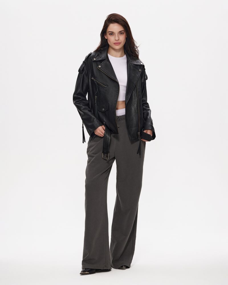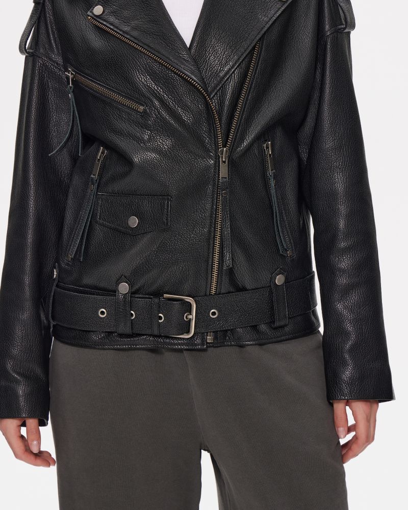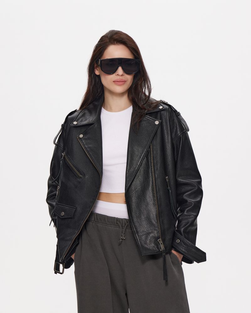 Куртка-косуха в черном цвете из натуральной кожи премиум качества из кожи jumbo. Куртка выполнена в стиле oversize и дополнена качественной фурнитурой и ремнем в тон внизу.