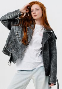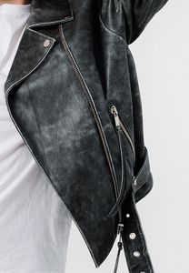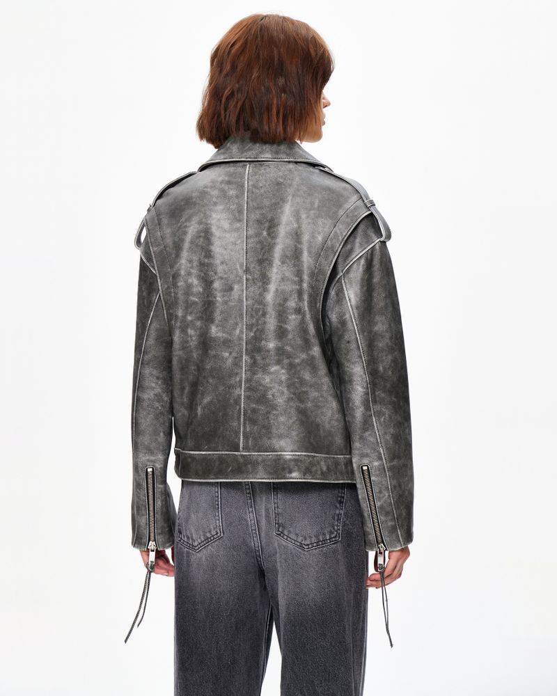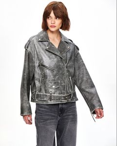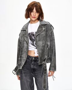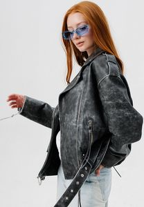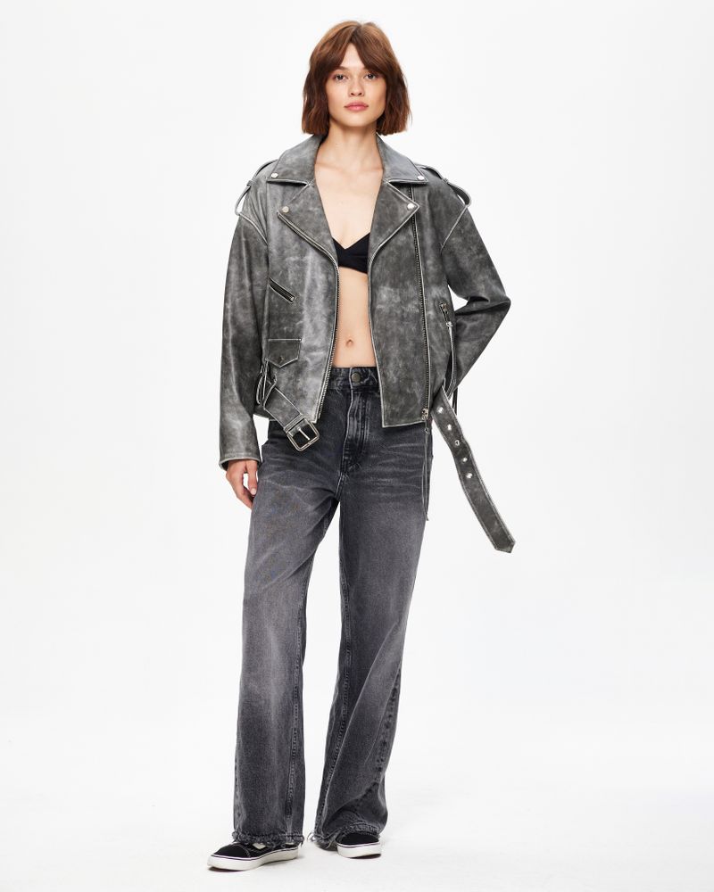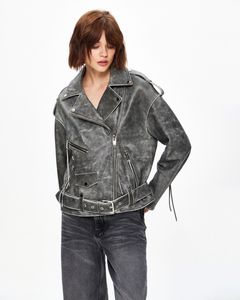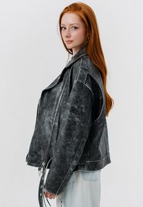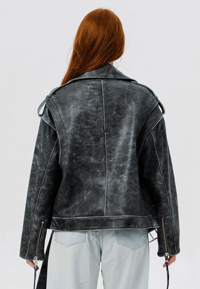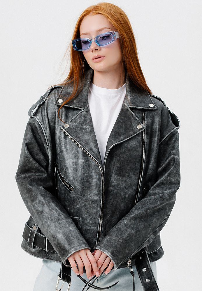 Стильная куртка-косуха с потертостями в стиле винтаж серого цвета из натуральной кожи премиум качества. Куртка выполнена в стиле oversize. Дополнена качественной фурнитурой серебряного цвета, спереди косая застежка, внизу ремень в тон.