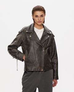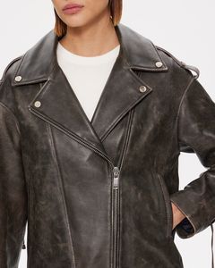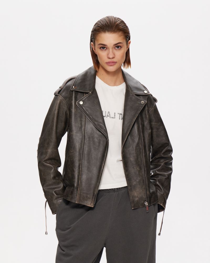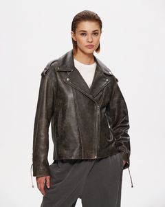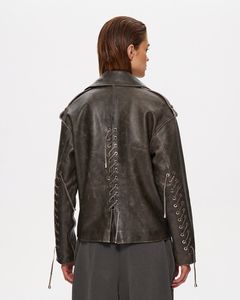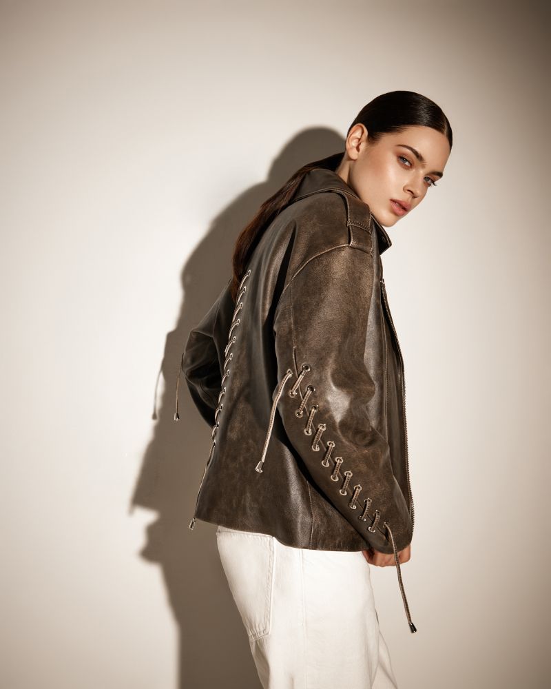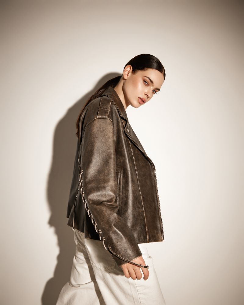 Куртка темно-коричневого цвета из натуральной кожи премиум качества в стиле винтаж с потертостями. Куртка выполнена в стиле oversize и дополнена качественной фурнитурой и шнуровкой на рукавах, спереди косая застежка.