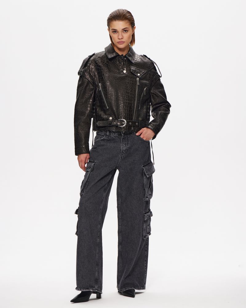 Куртка черного цвета из натуральной кожи премиум качества под крокодила. Куртка выполнена в стиле oversize и дополнена качественной фурнитурой и ремнем внизу.