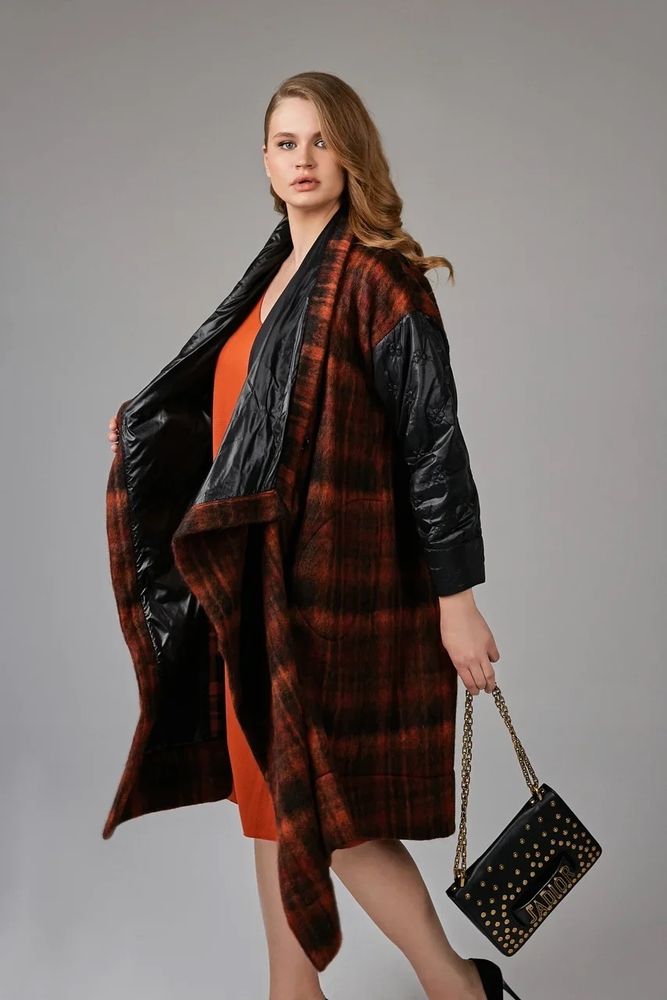 Пальто с шерстью в составе с принтом клетка, на запах.