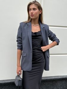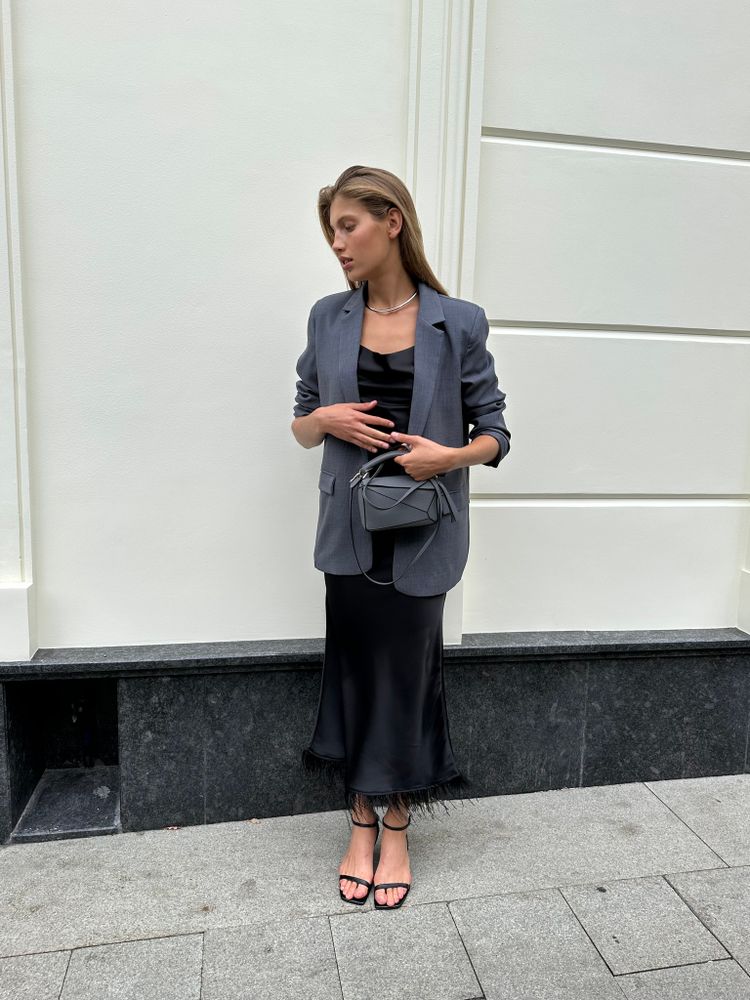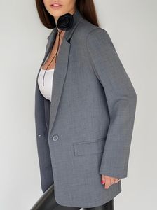 Пиджак представлен в двух базовых цветах: черный и серый, в стиле oversize свободного кроя, застегивается на одну пуговицу.