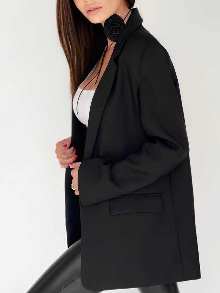 Пиджак представлен в двух базовых цветах: черный и серый, в стиле oversize свободного кроя, застегивается на одну пуговицу.