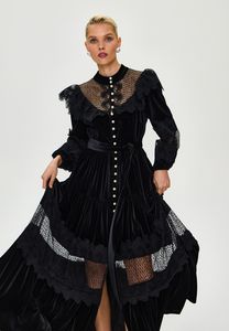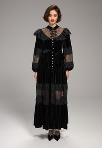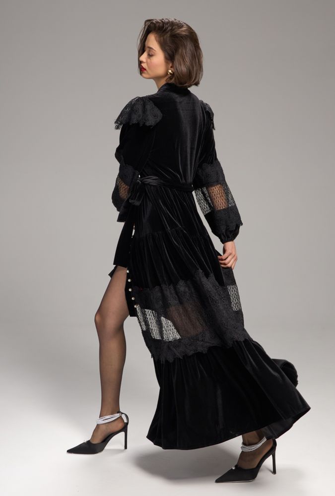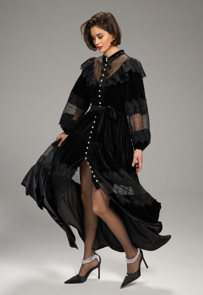 Платье из бархата с кружевной отделкой, украшено жемчужными пуговицами.