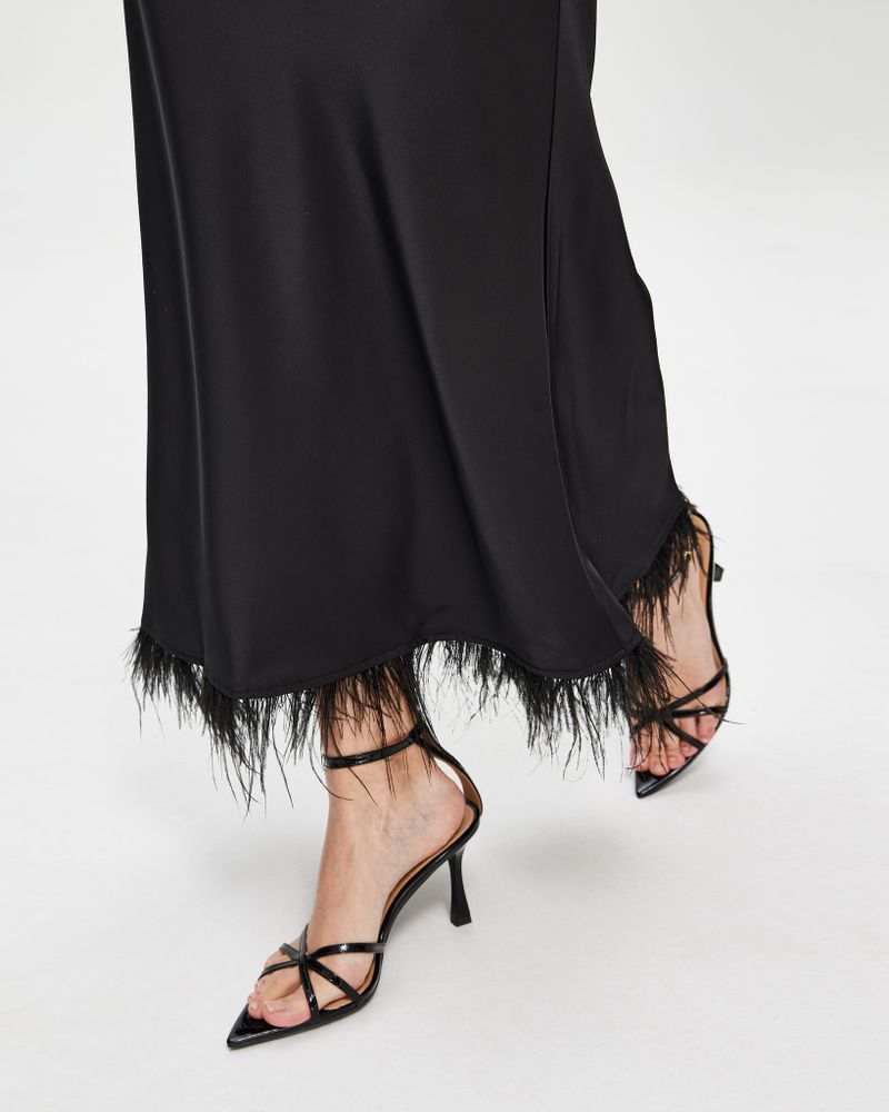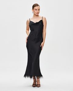 Платье-комбинация длинное облегающее из атласа на бретелях, внизу отделка перья.