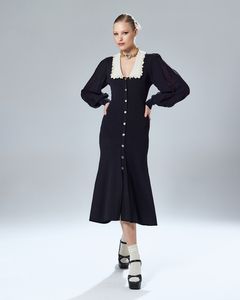 Трикотажное платье длины миди с объемными рукавами фонариками и кружевным молочным воротничком, на пуговицах.