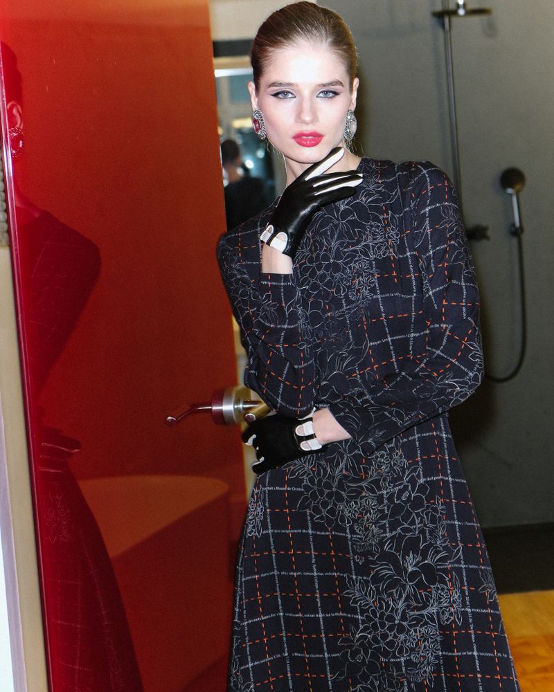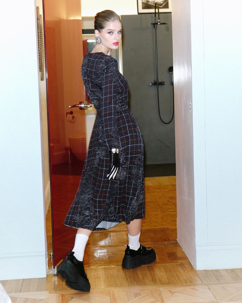 Платье длины миди с цветочным принтом и рыжей клеткой.