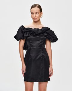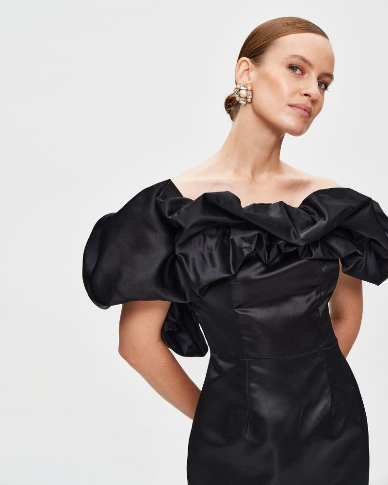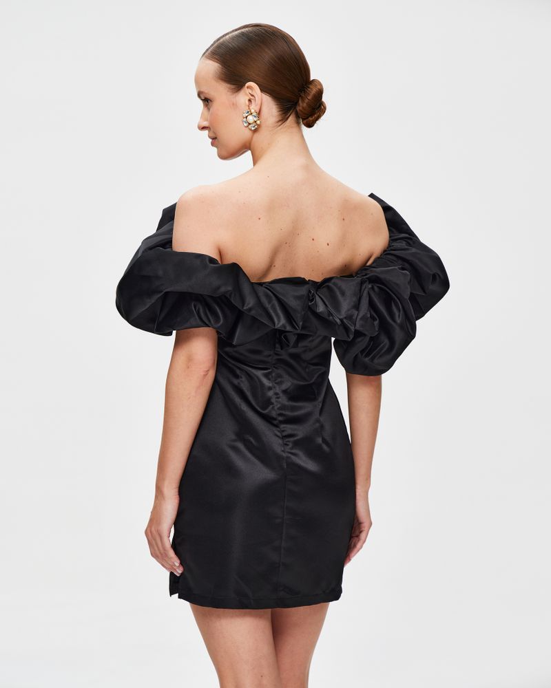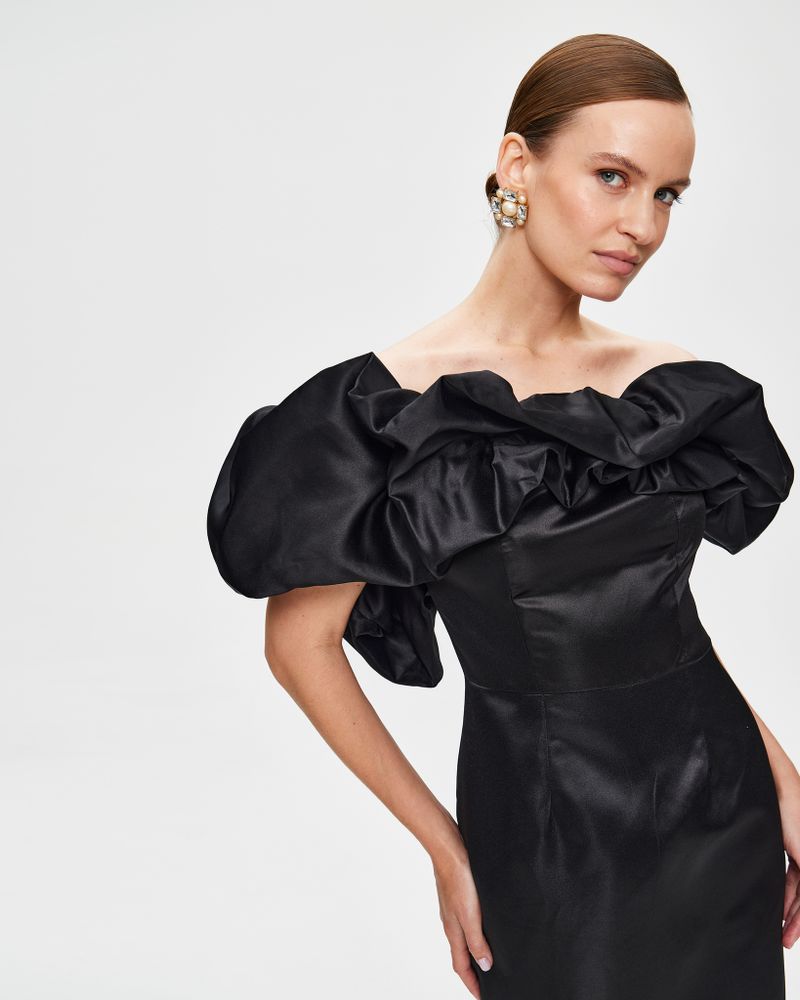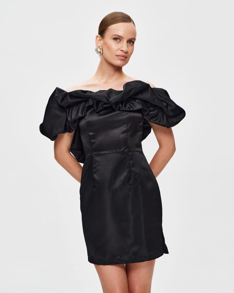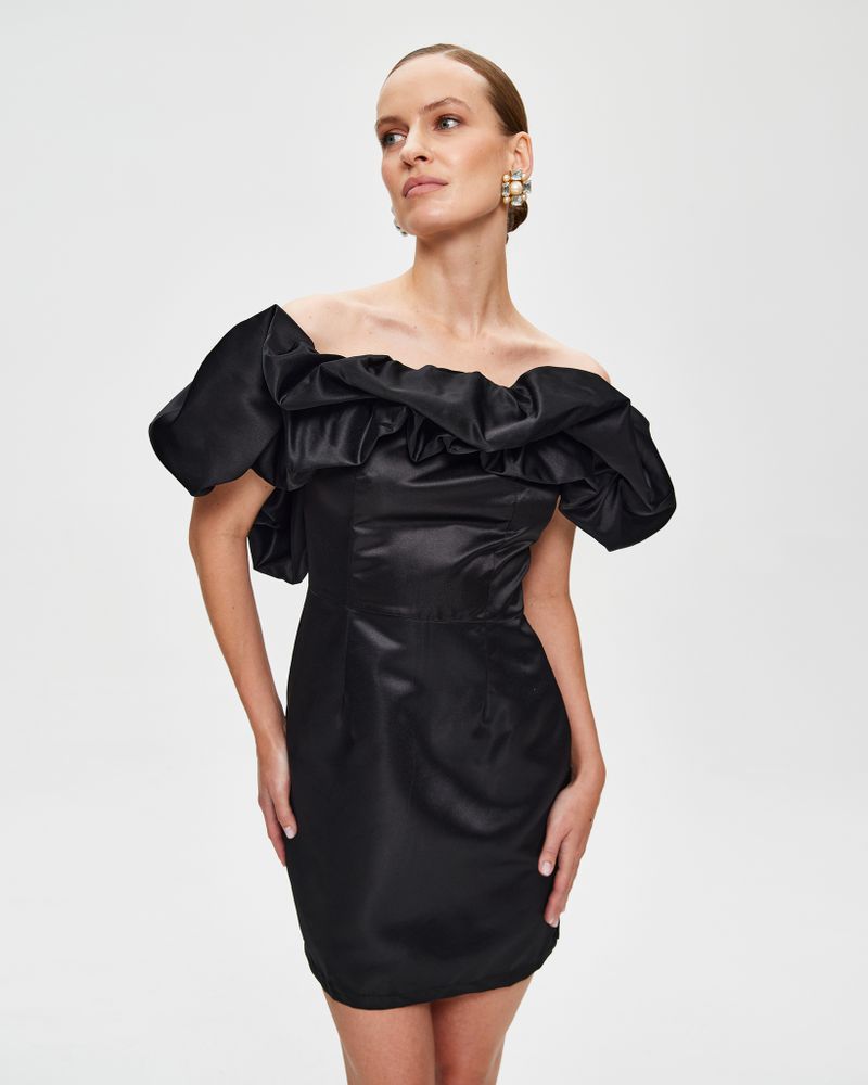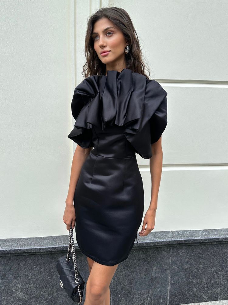 Платье мини бюстье облегающее из плотного атласа с прозрачными лямками, сверху на груди объемные оборки.