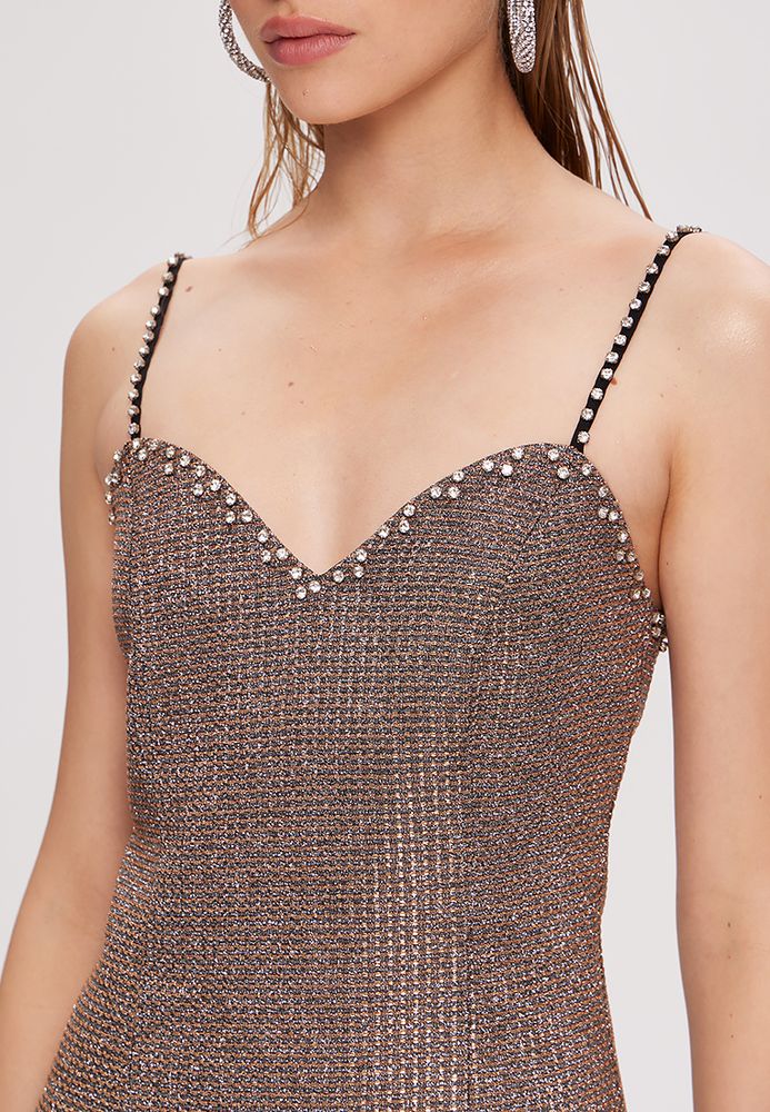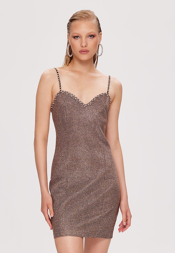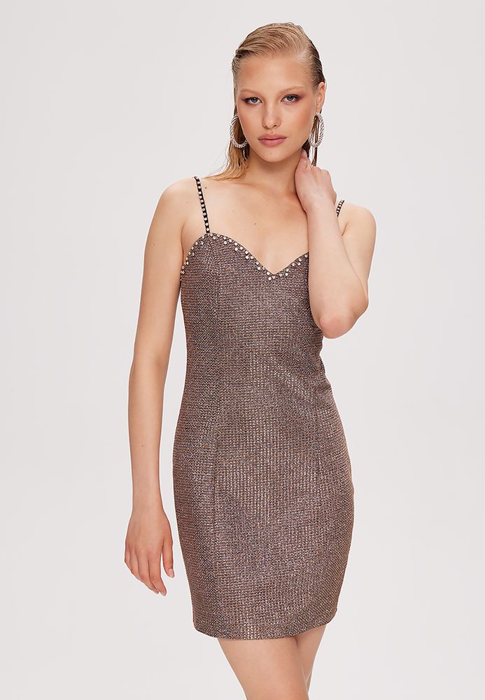 Платье мини по фигуре, на бретелях, блестящее.
