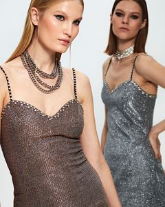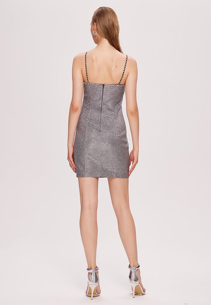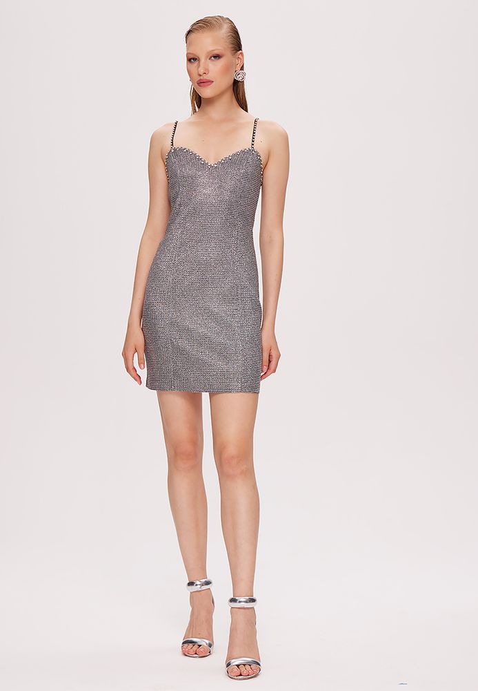 Платье мини по фигуре, на бретелях, блестящее.
