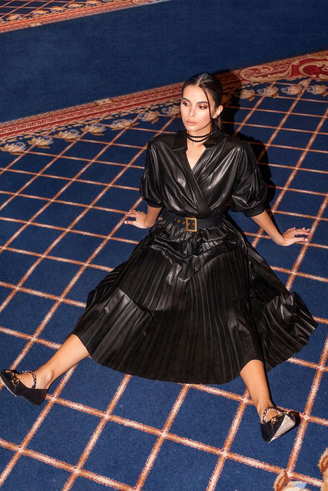 Платье из экокожи с укороченным рукавом и расклешенным плиссе снизу.
