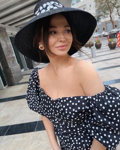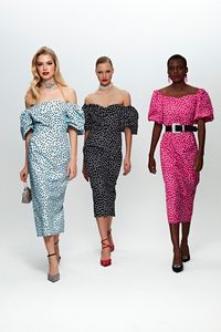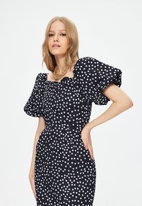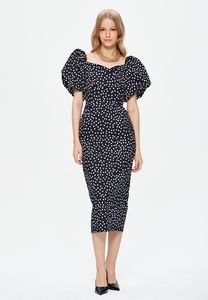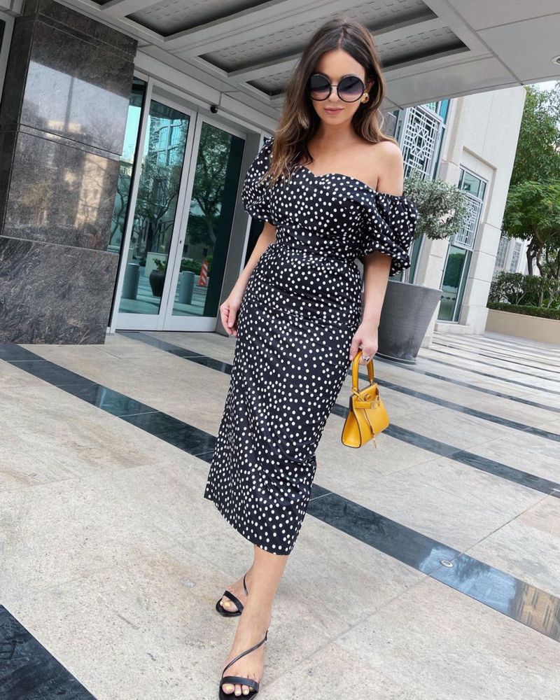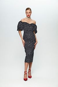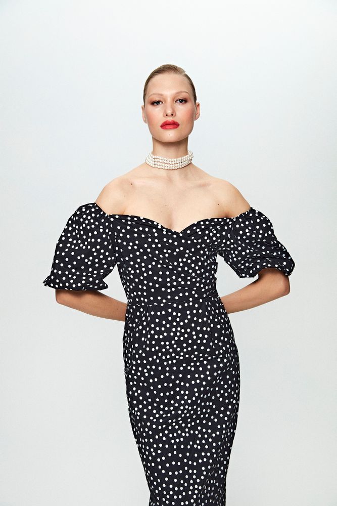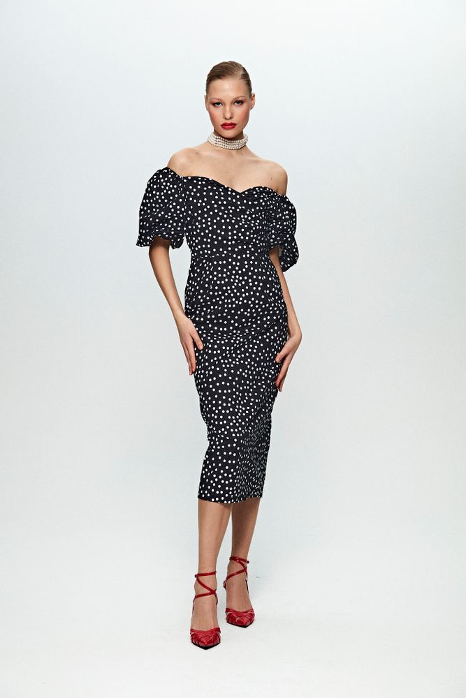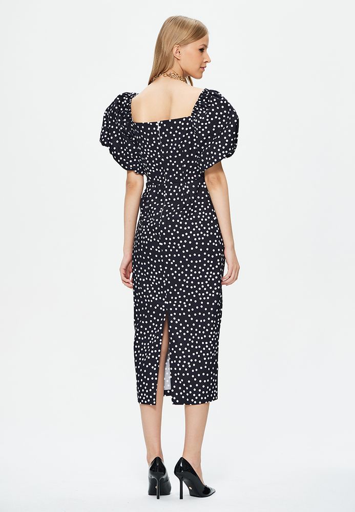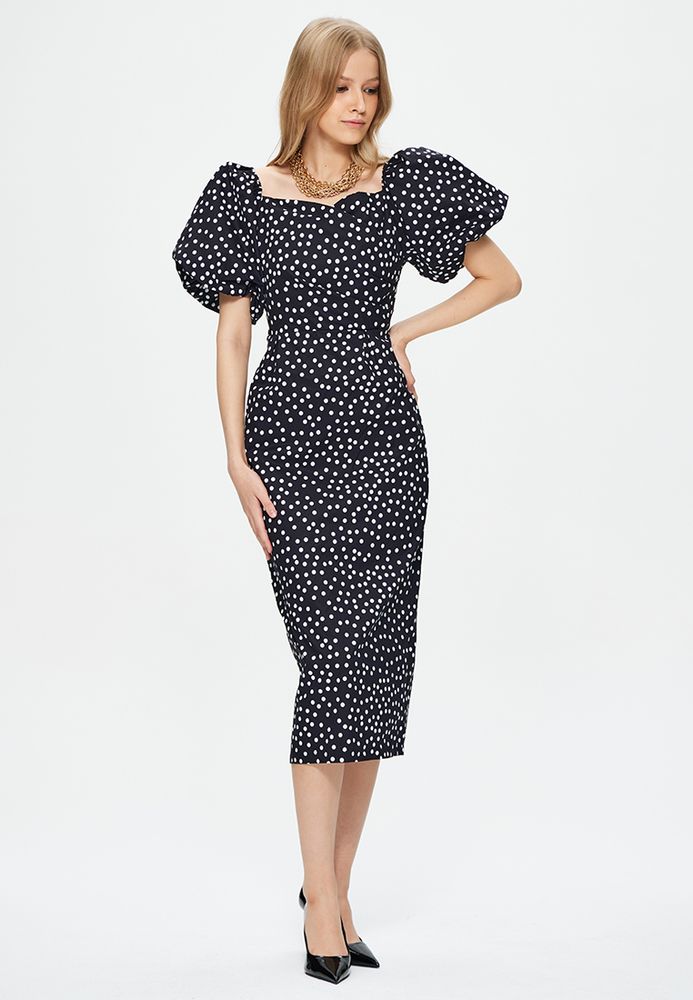 Платье-футляр в мелкий горошек, рукава фонарики.