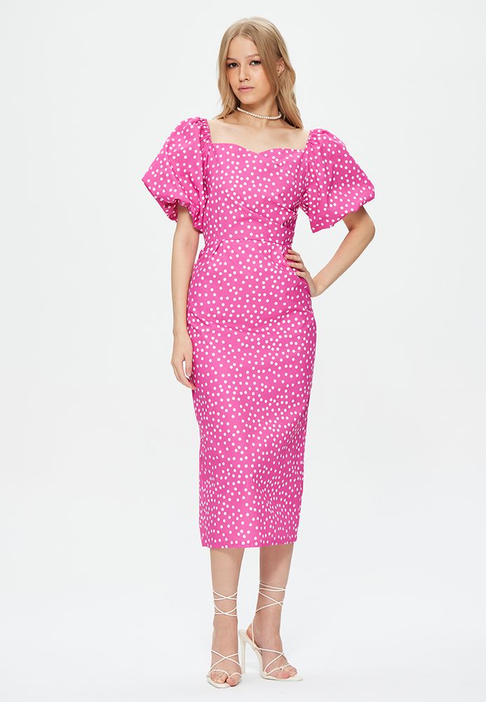 Платье-футляр в мелкий горошек, рукава фонарики.