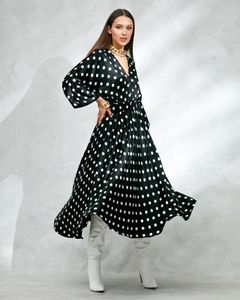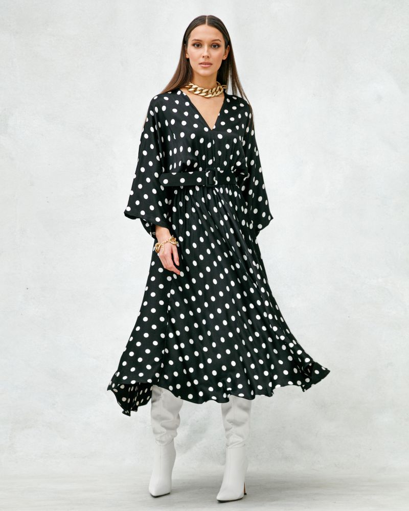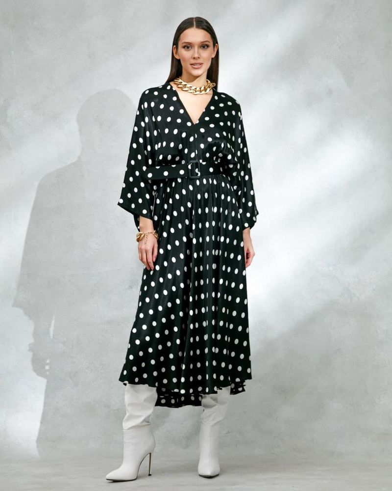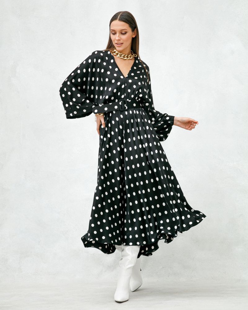 Платье сатиновое с принтом в большой горох, ремень в комплекте.