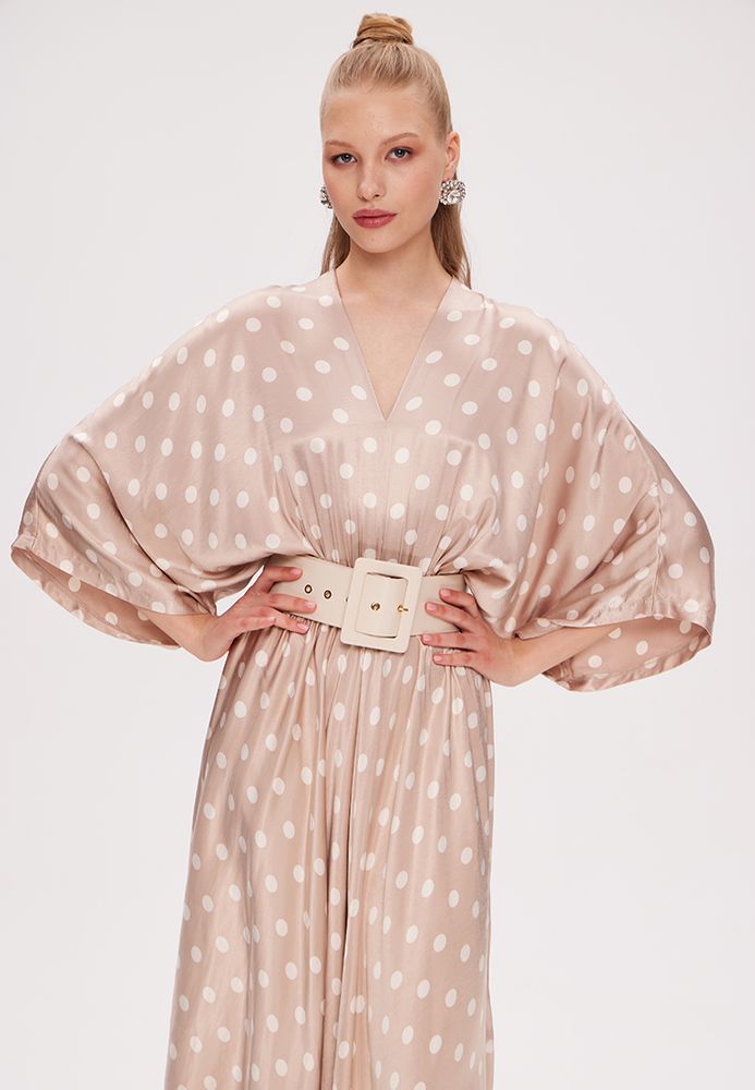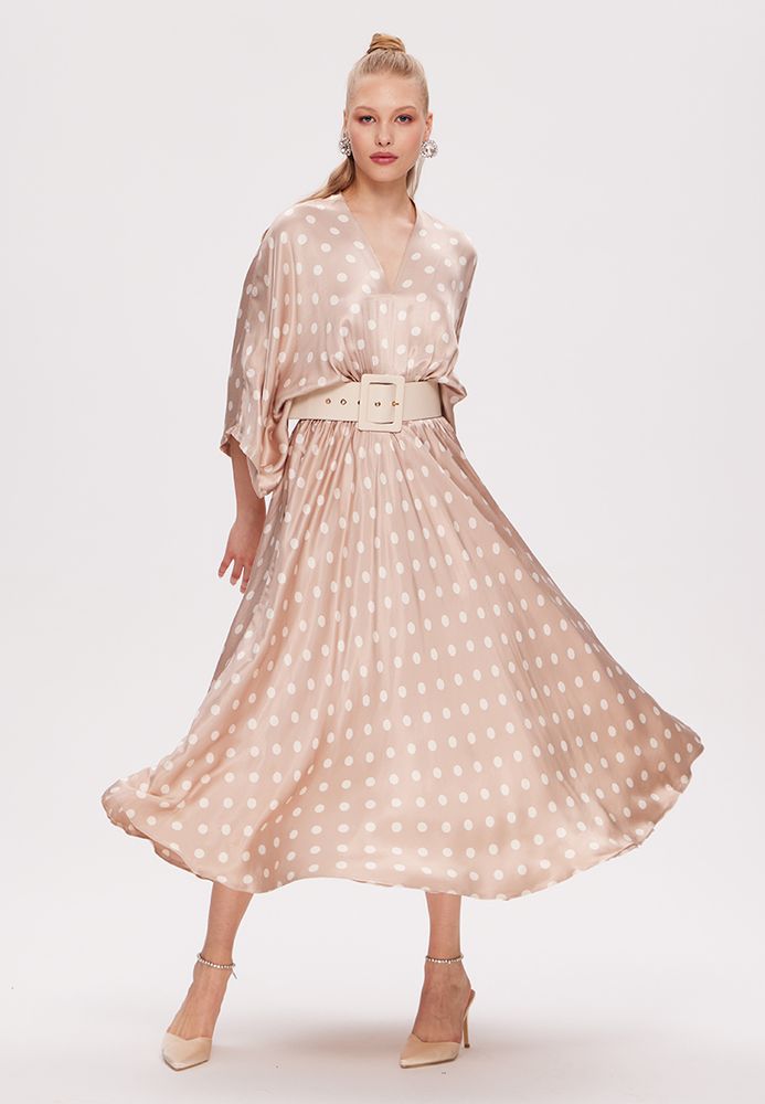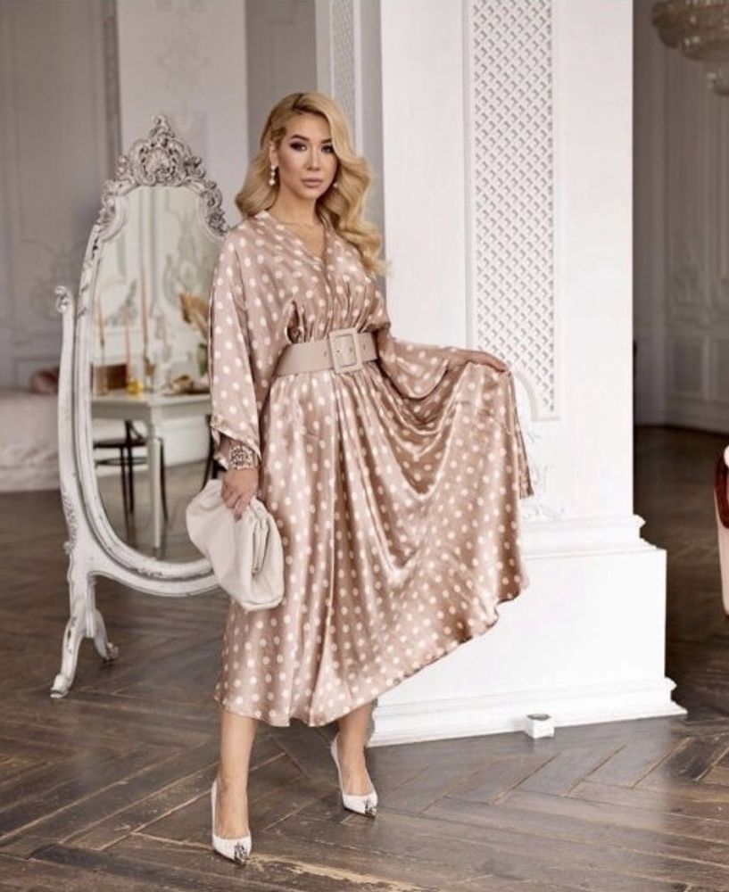 Платье сатиновое с принтом в большой горох, ремень в комплекте.