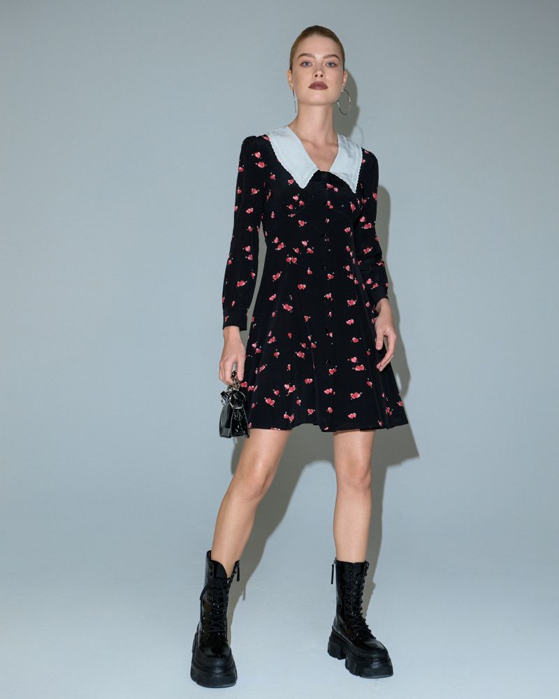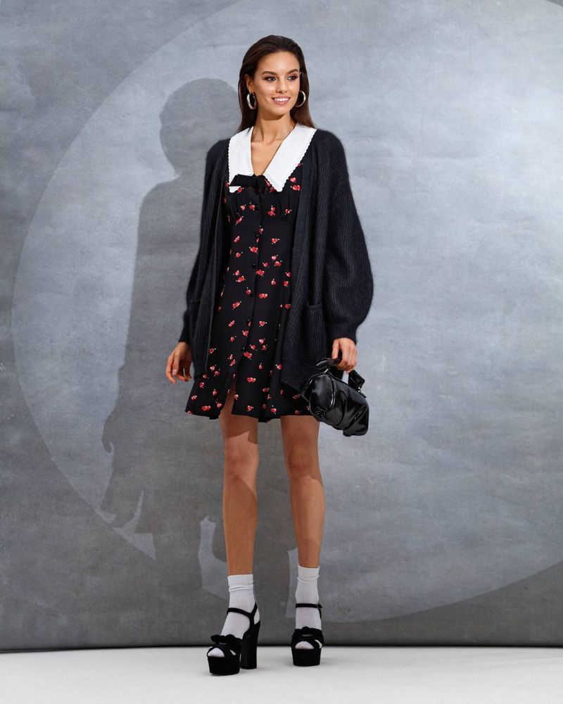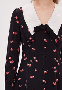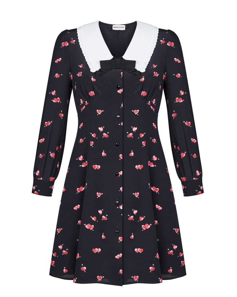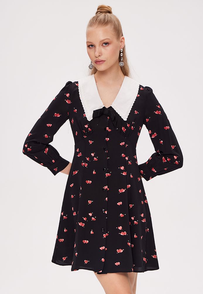 Платье мини с шелком в составе с принтом сердечки и белым кружевным воротником.