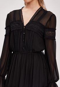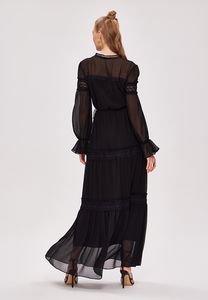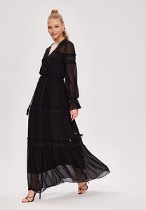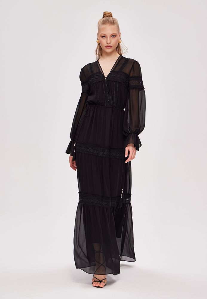 Шифоновое длинное платье в стиле бохо с кружевной отделкой и завязками на талии.