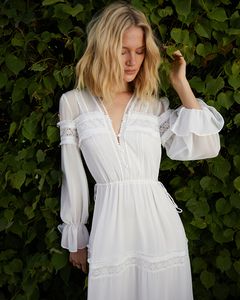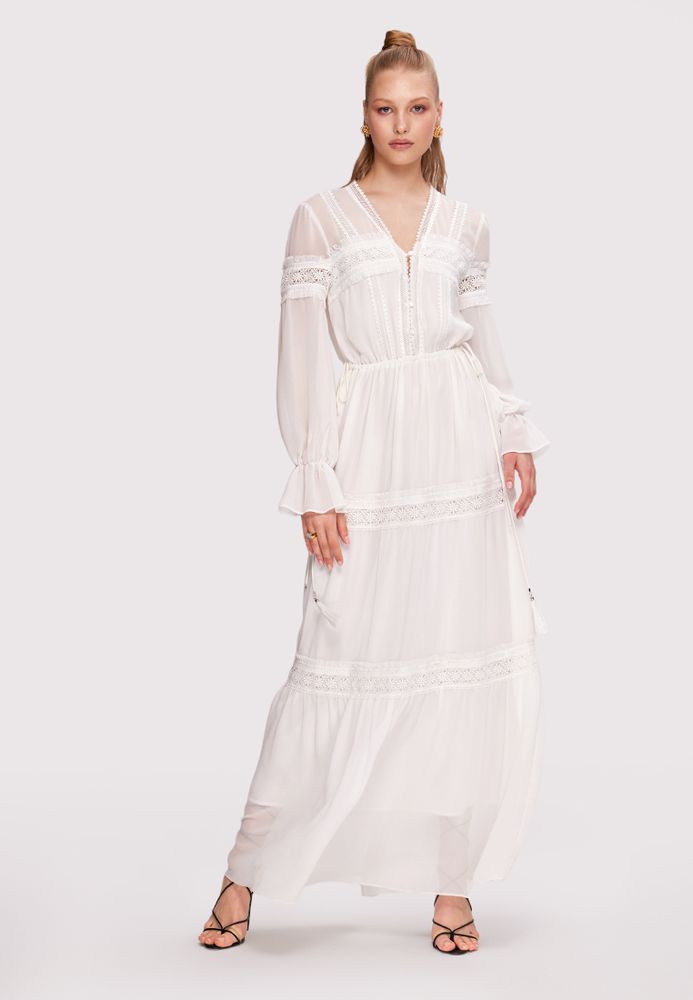 Шифоновое длинное платье в стиле бохо с кружевной отделкой и завязками на талии.
