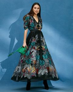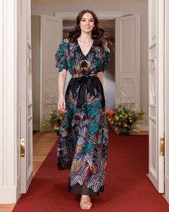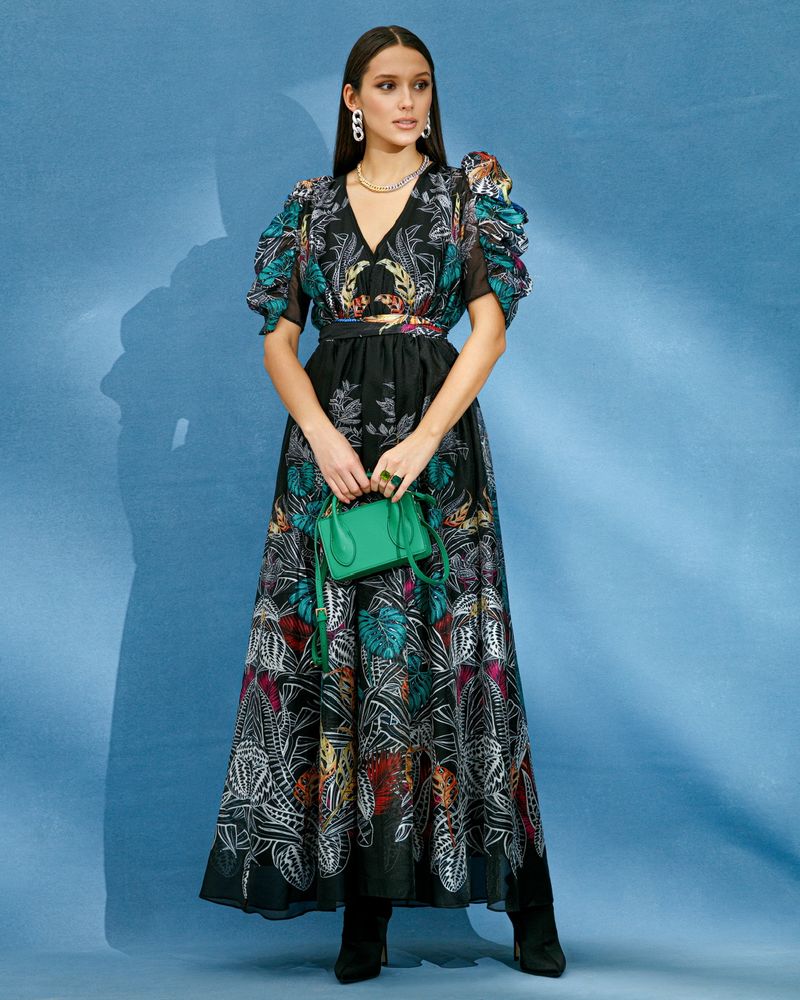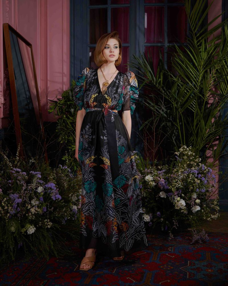 Платье с растительным принтом и сборкой на рукаве, шелк в составе.