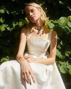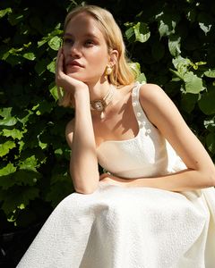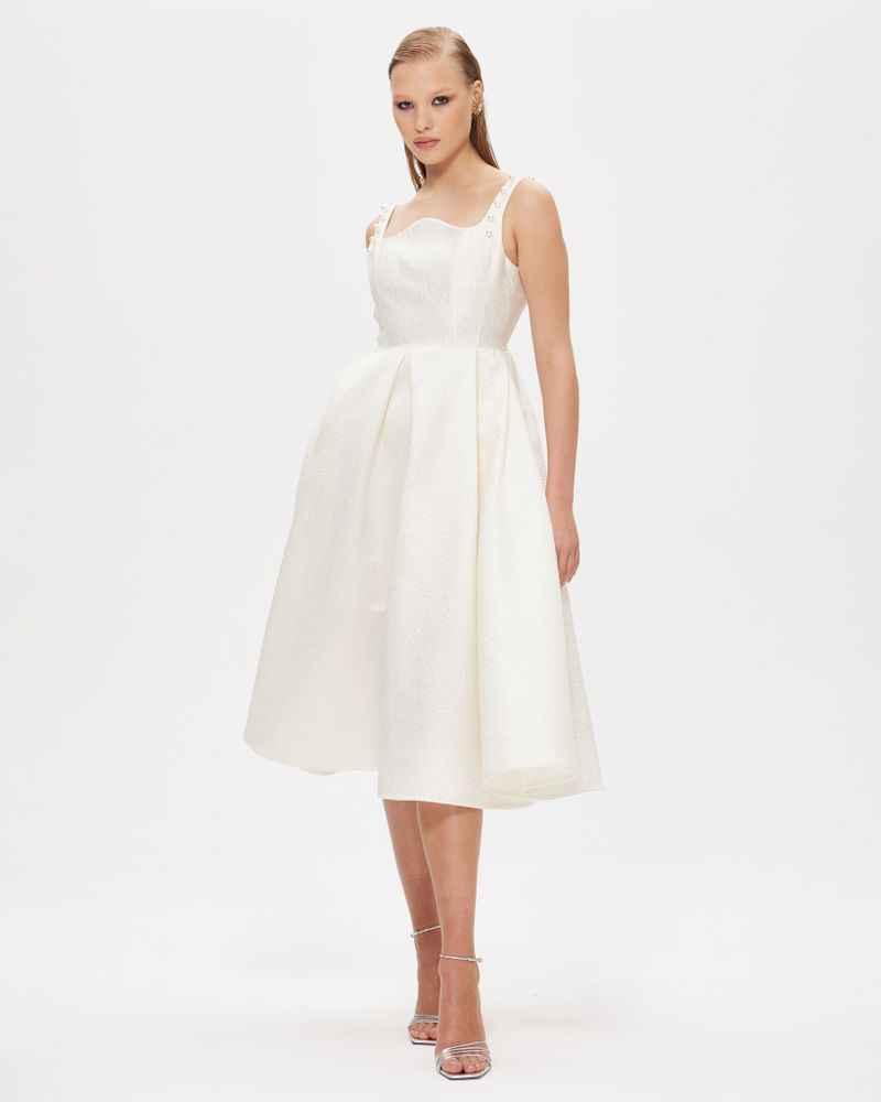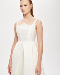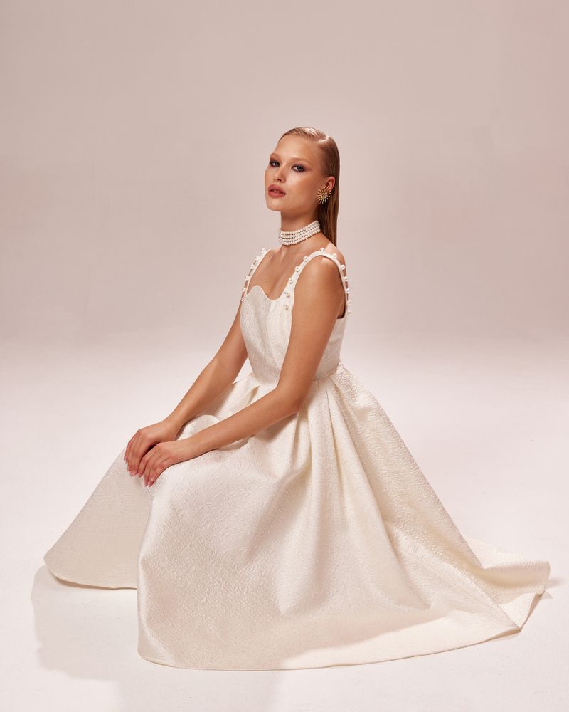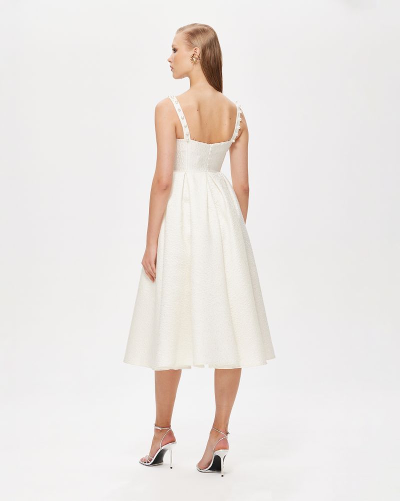 Платье молочного цвета с фактурным рисунком из плотного жаккарда на подкладке. Верх лямок расшит жемчугом.