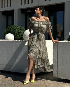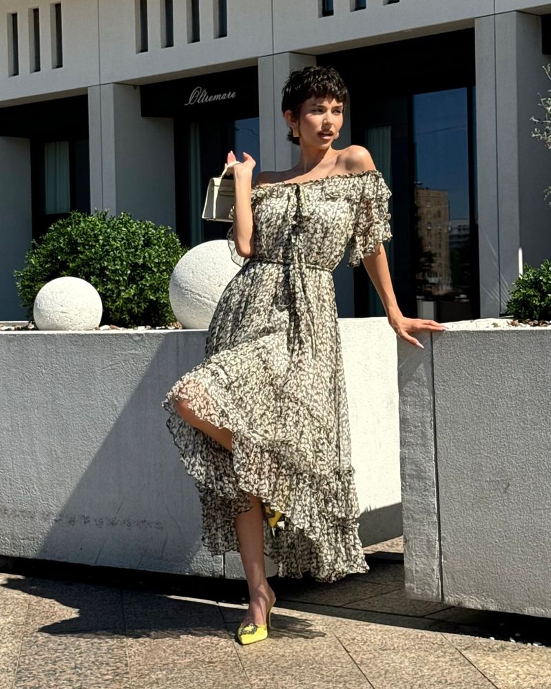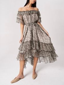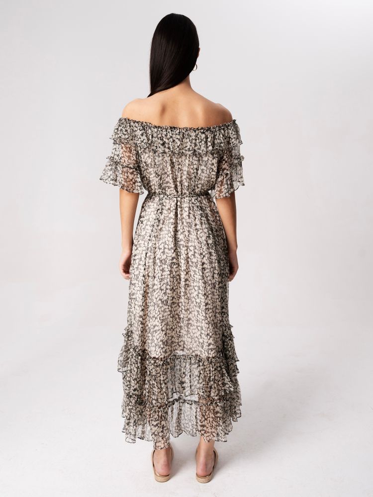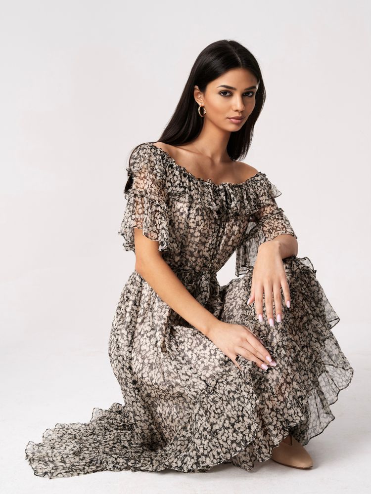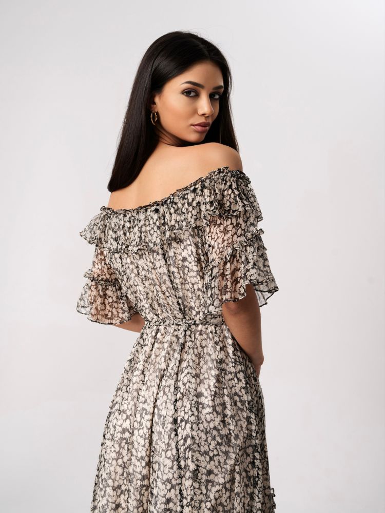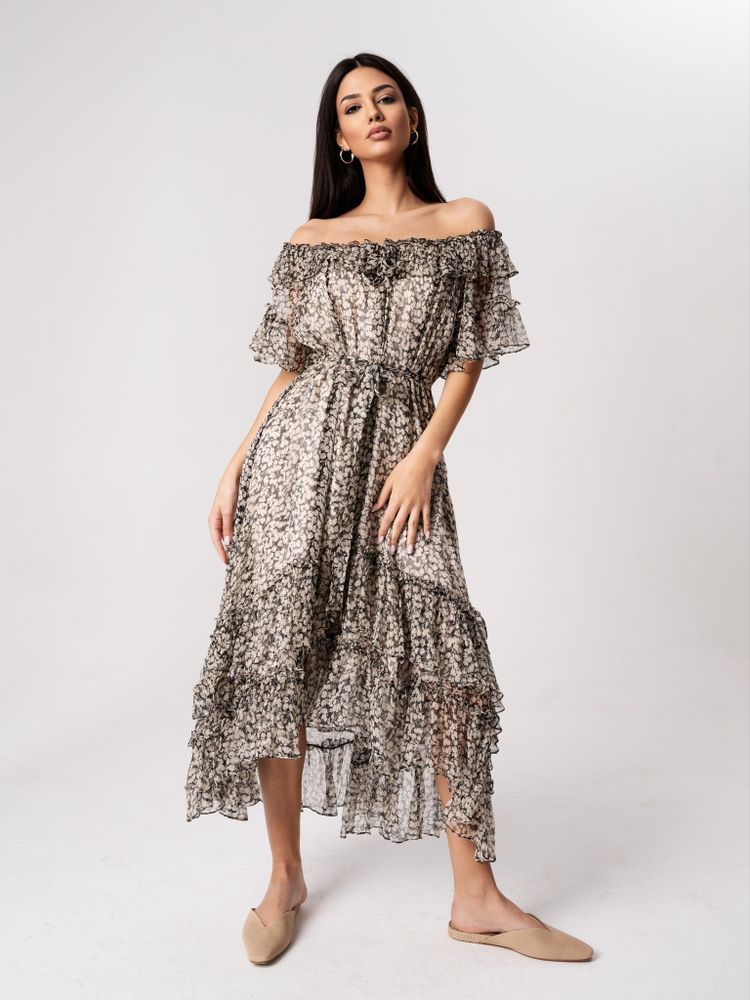 Платье крестьянка из натурального шелка с коротким рукавом с рюшами и поясом в комплекте. Свободный летящий крой