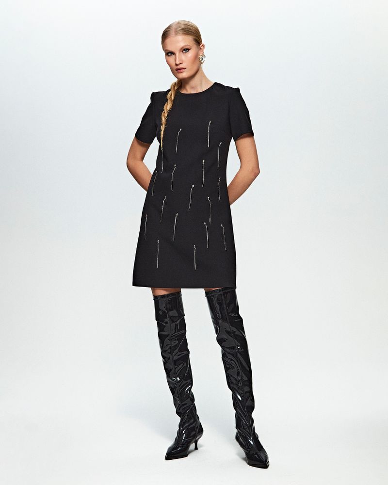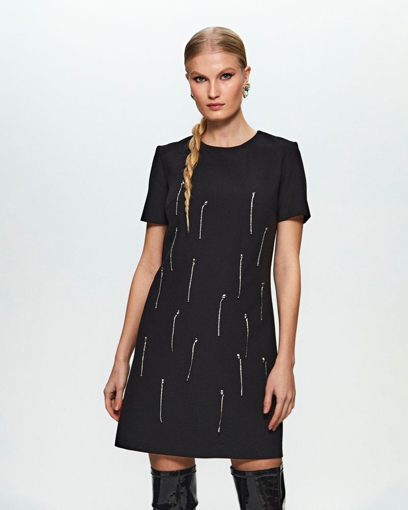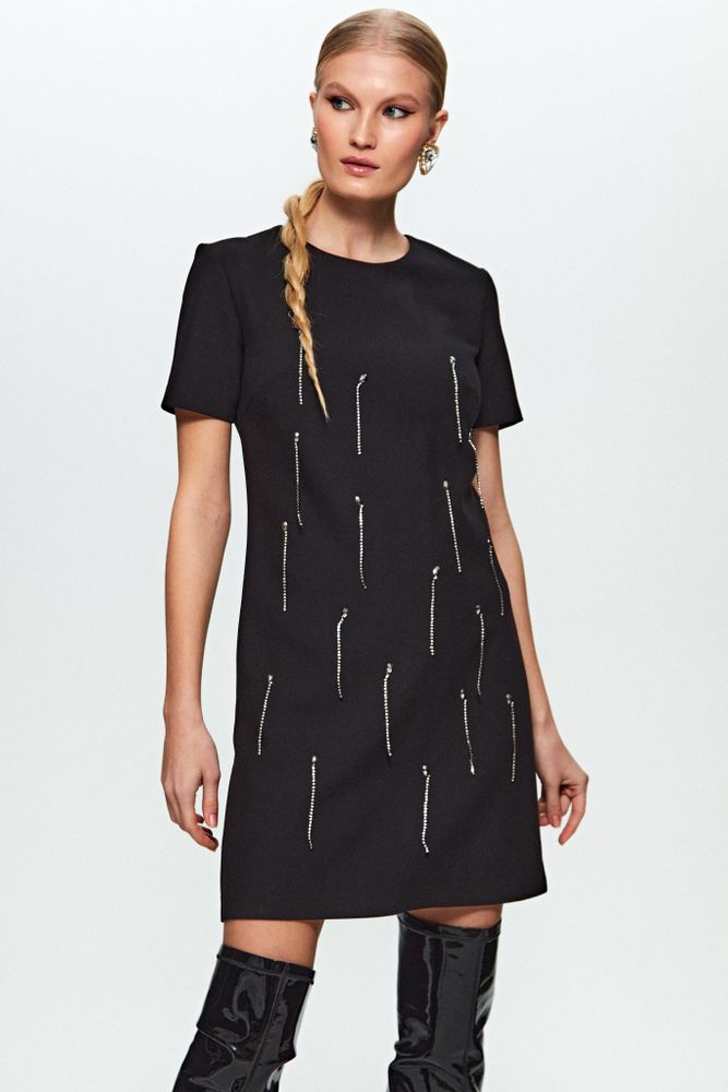 Платье свободного кроя с декоративными лентами расшитыми стразами.