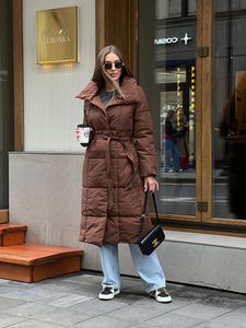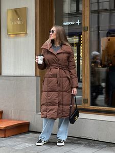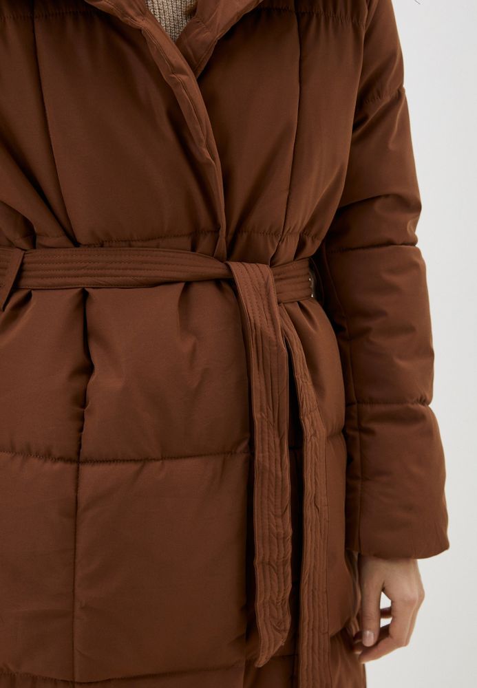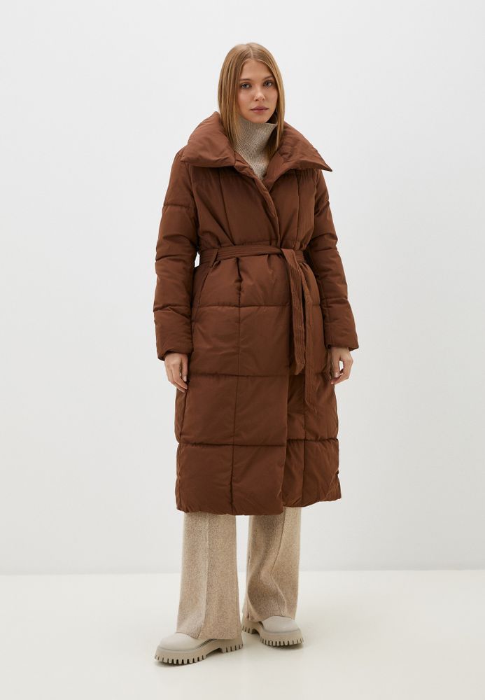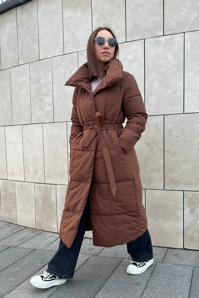 Пуховик зимний длинный стеганый на поясе, с объемным воротником, застежка на кнопки, на рукавах трикотажные резинки. Представлен в трех актуальных цветах: коричневый, черный, хаки.