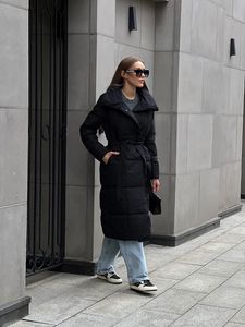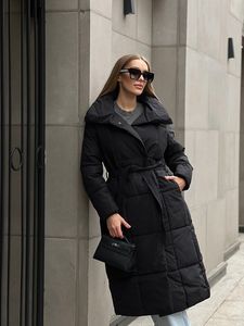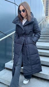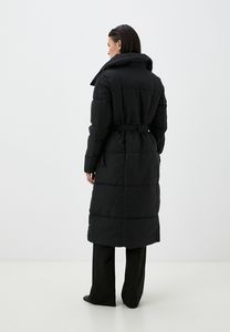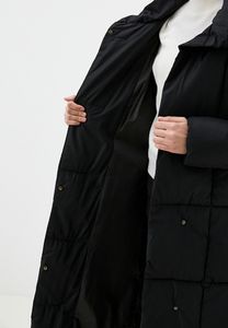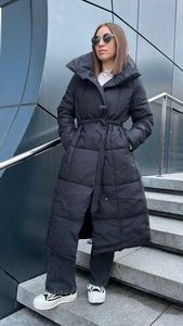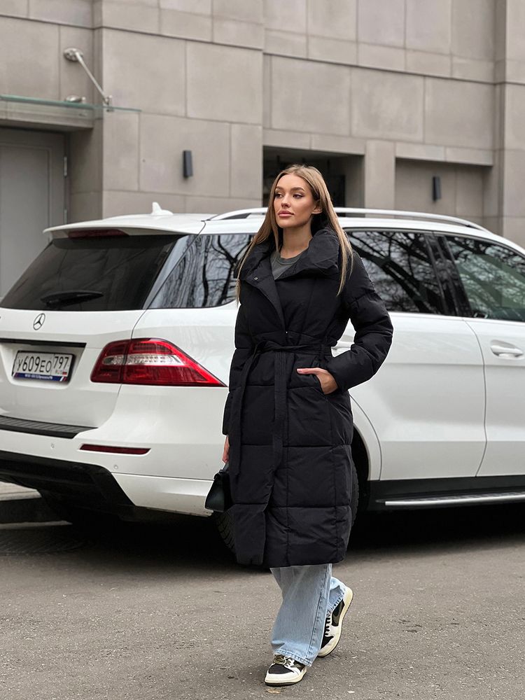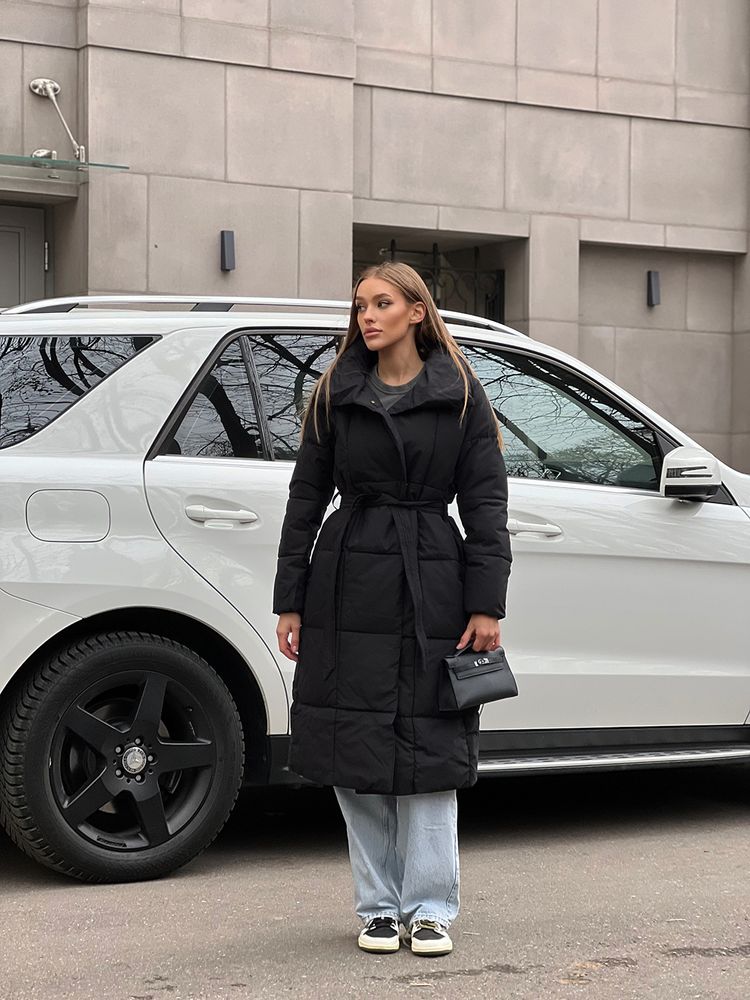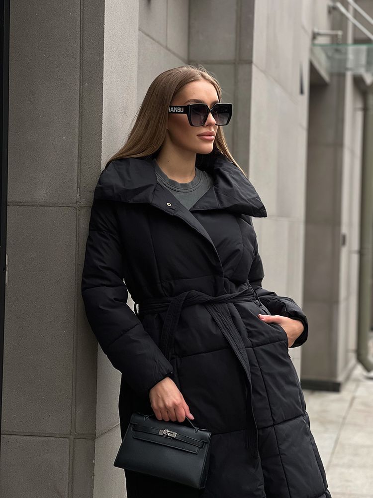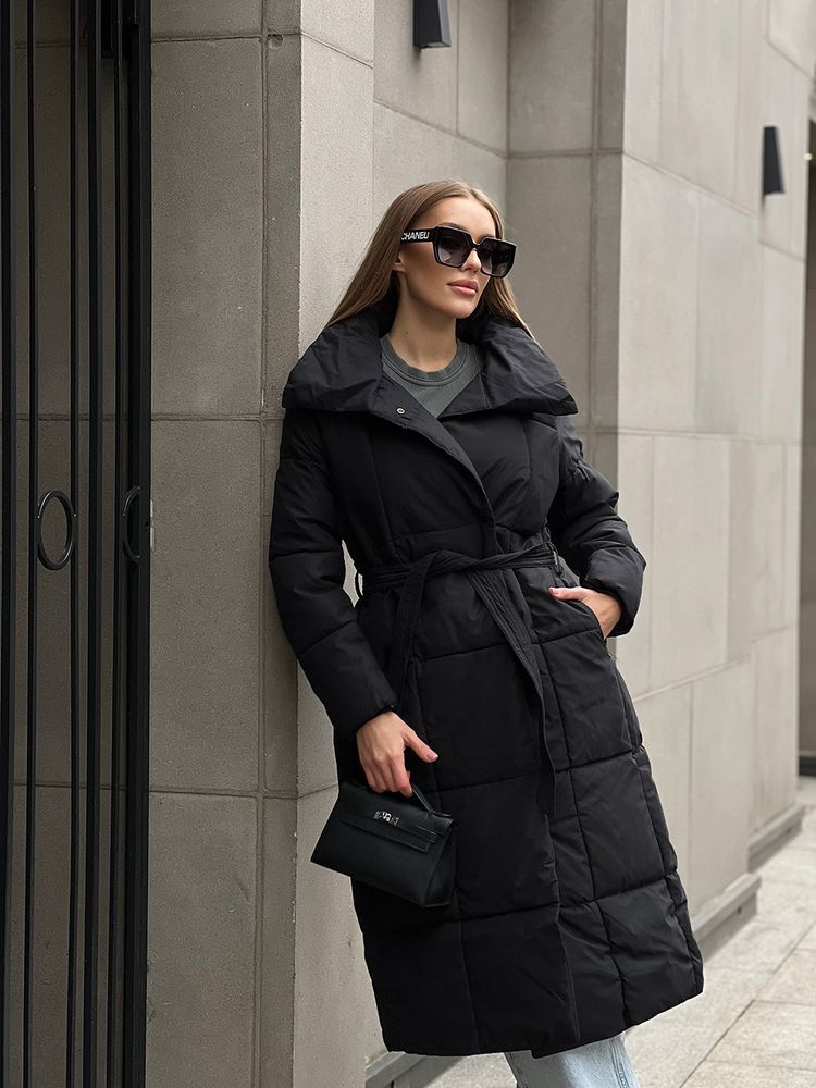 Пуховик зимний длинный стеганый на поясе, с объемным воротником, застежка на кнопки, на рукавах трикотажные резинки. Представлен в трех актуальных цветах: коричневый, черный, хаки.