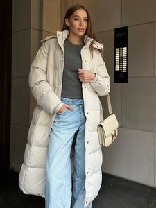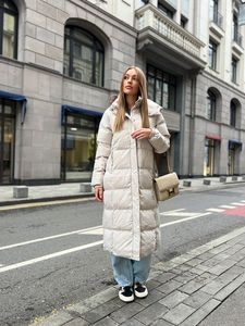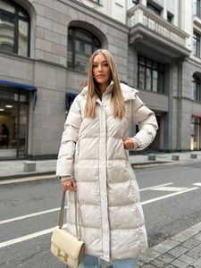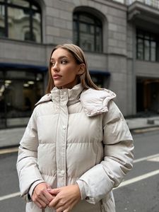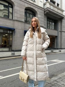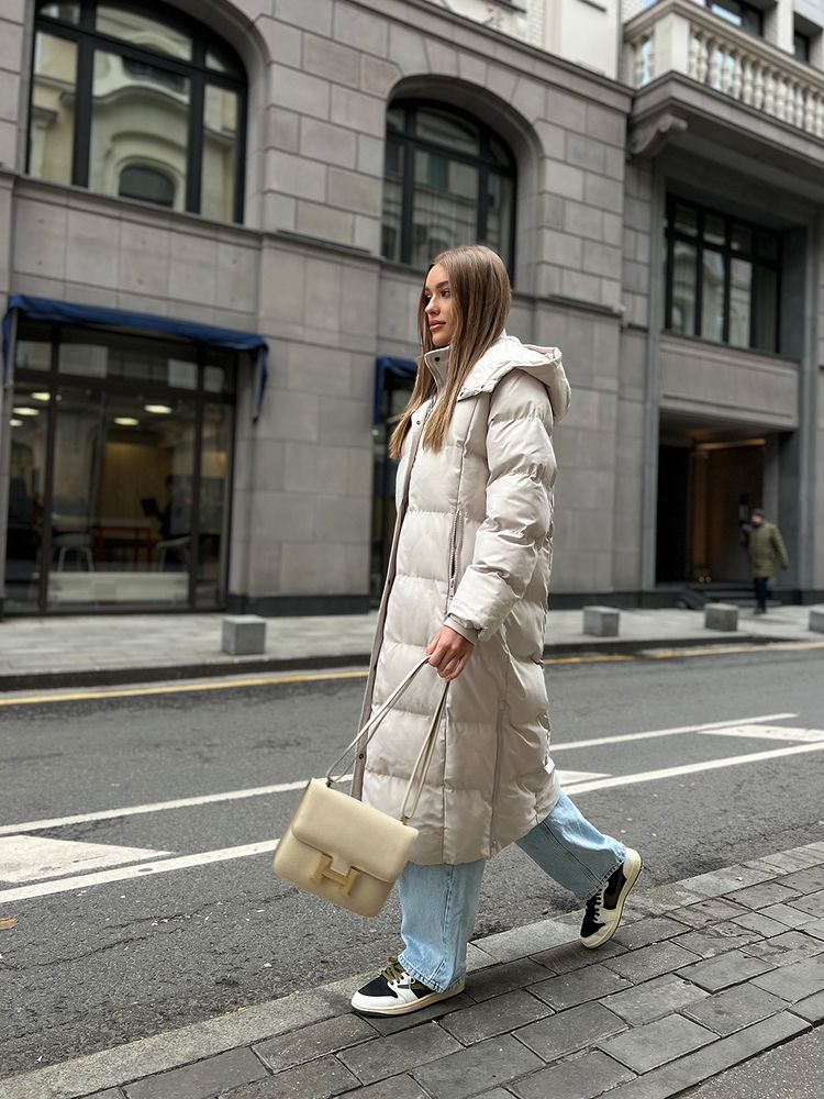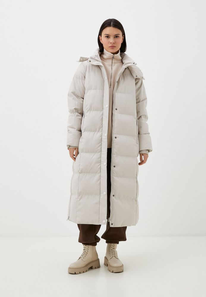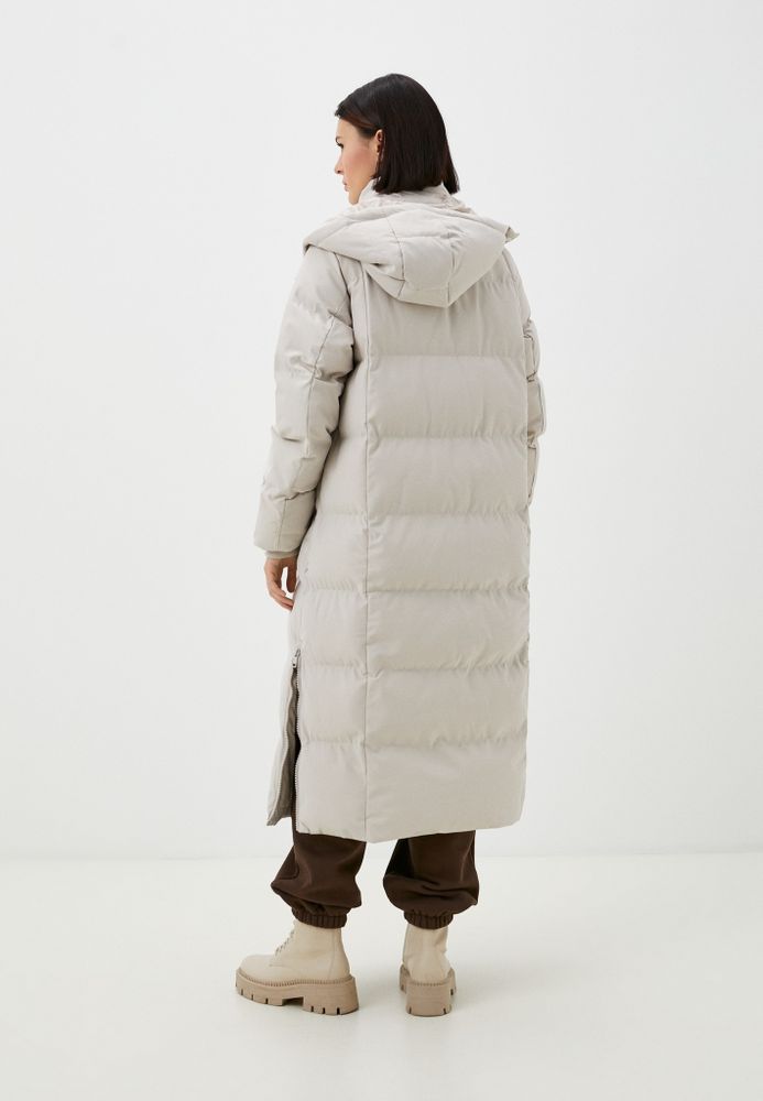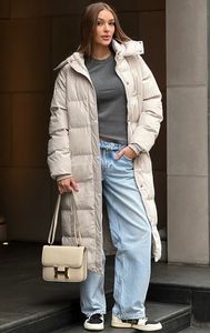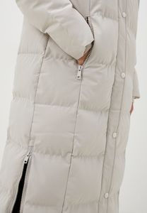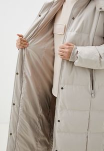 Пуховик зимний длинный со съемным капюшоном, застежка на молнию и клепки, сбоку прорезные карманы, снизу по бокам молнии для удобства во время ходьбы.