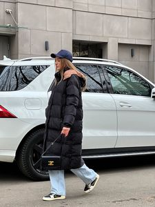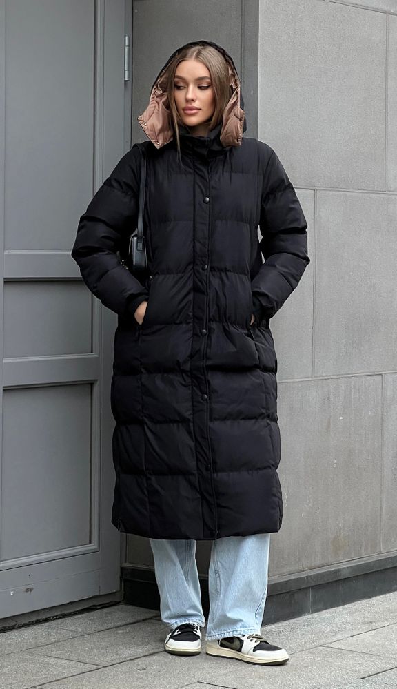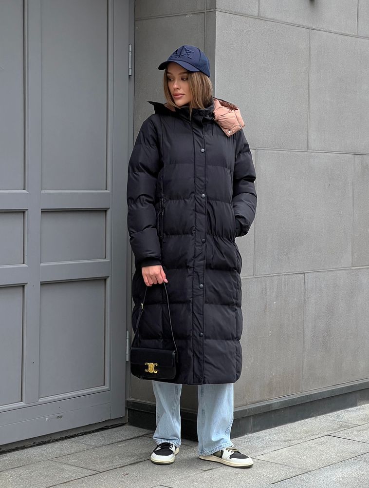 Пуховик зимний длинный со съемным капюшоном, застежка на молнию и клепки, сбоку прорезные карманы, снизу по бокам молнии для удобства во время ходьбы.