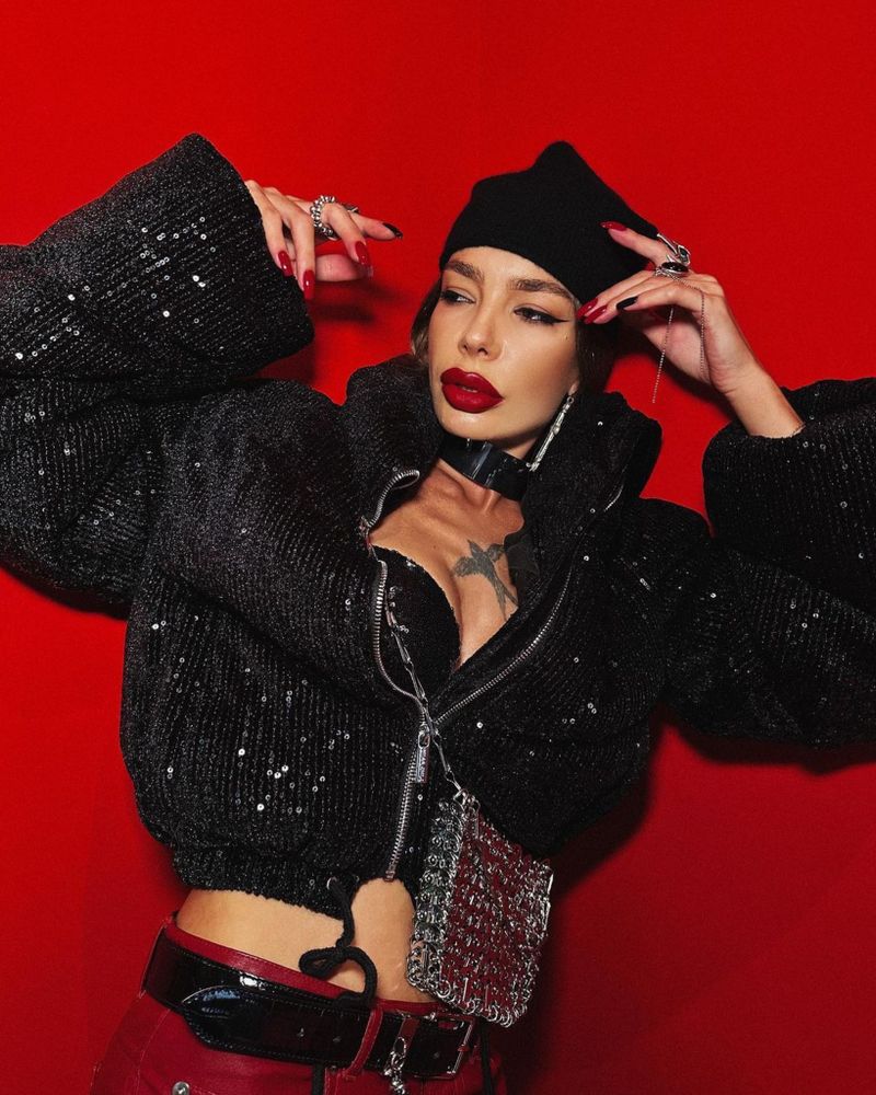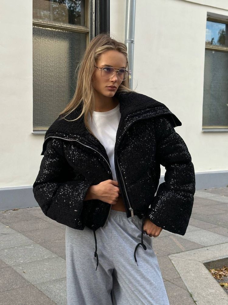 Стильный укороченный пуховик расшитый пайетками с меховым воротником, представлен в двух цветах: богатый золотой и элегантный черный.